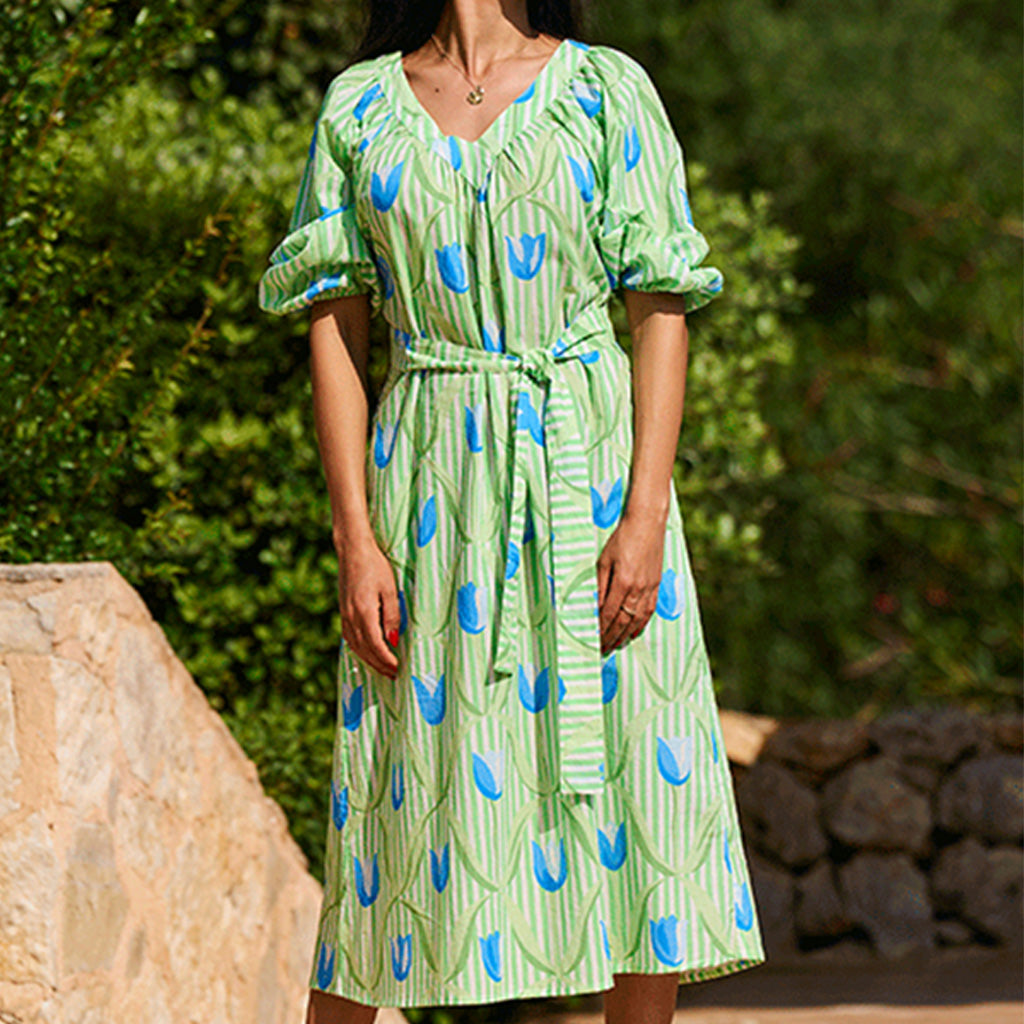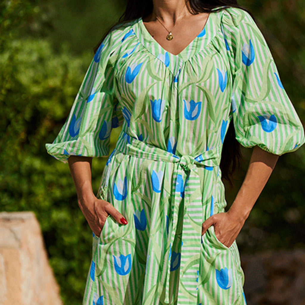 Breezy, playful, and versatile, the Cannes cotton dress combines a vibrant tulip print with an optional belt, button detailing, and pockets. Perfect for relaxed summer days or evening strolls