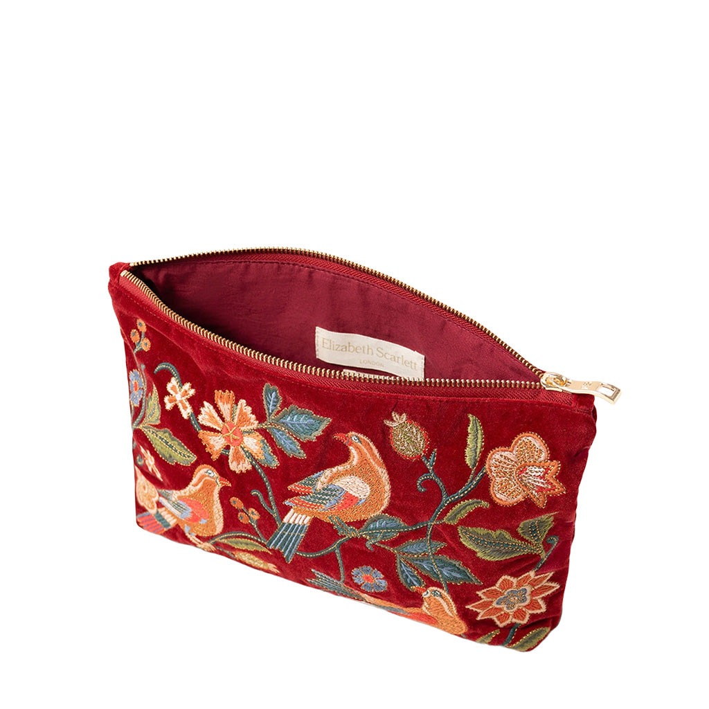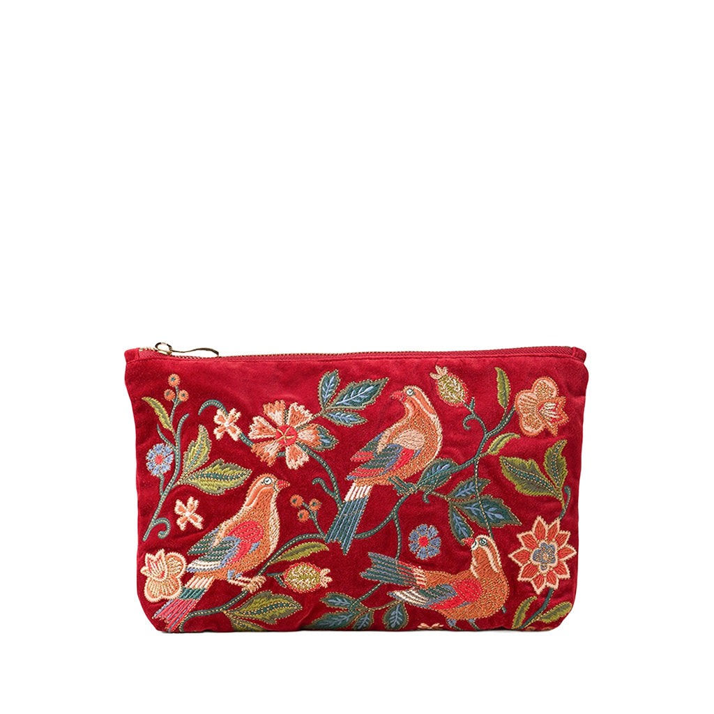 Bring the romantic beauty of an English garden to daily routines. Featuring birds nestling among climbing vines and autumnal blooms this embroidered pouch is perfect for beautifully organising everyday essentials and other treasures at home or on the go