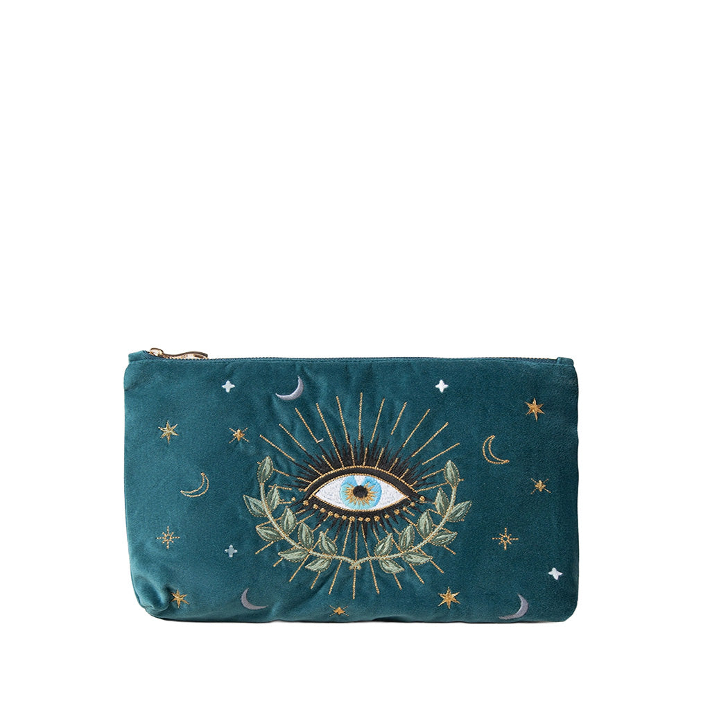 All eyes on this dreamy Pouch. Inspired by ancient beliefs, this design features an embroidered all-seeing eye, beautifully partnered with cosmic stars and moons