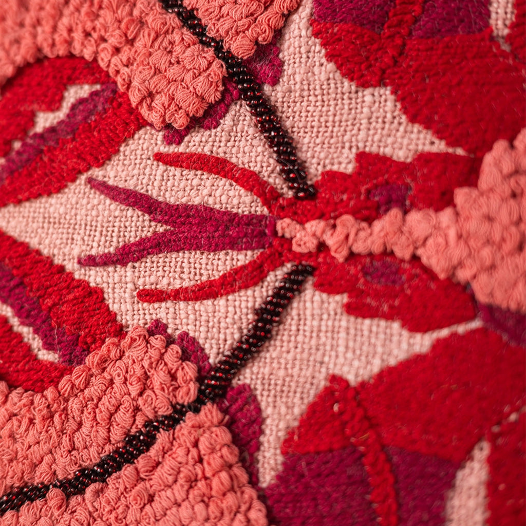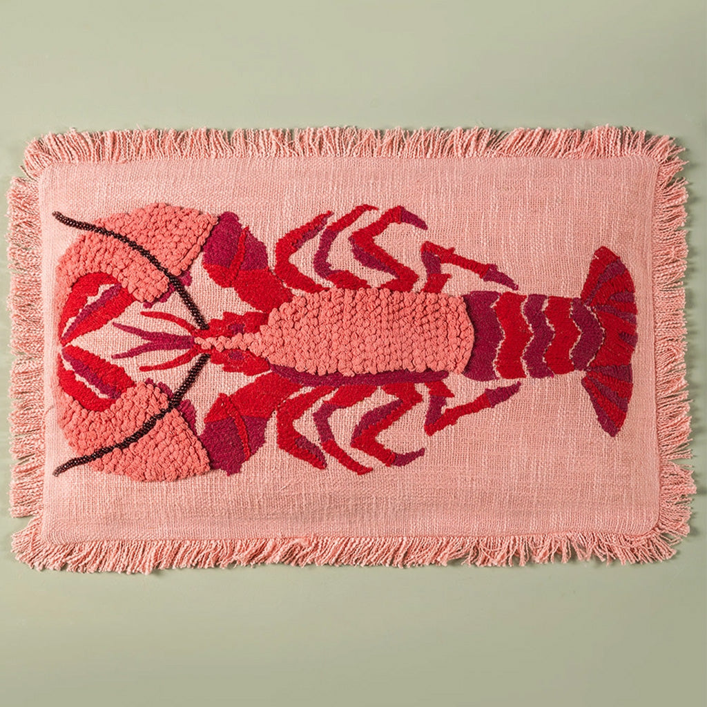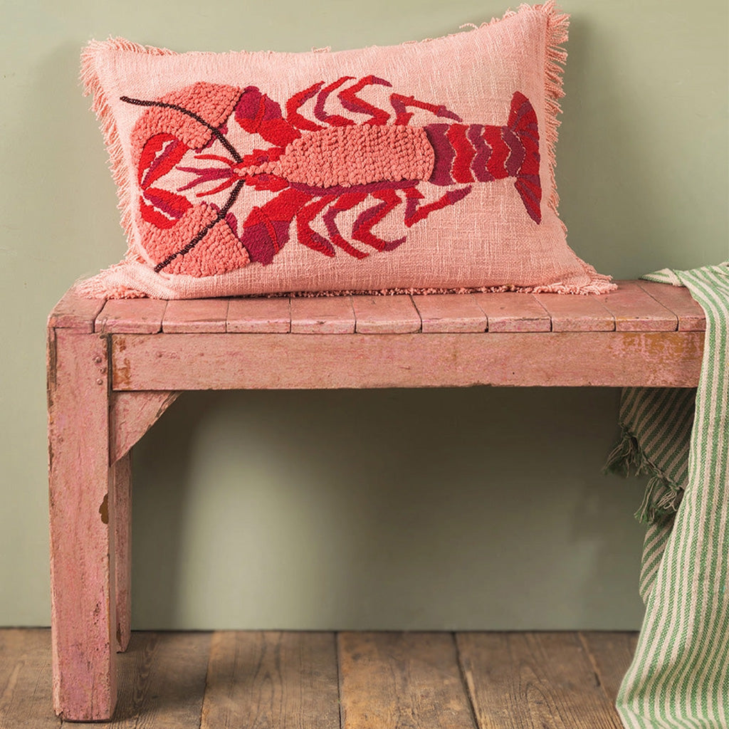 This striking and funky pink and red lobster cushion has been created with beautiful embroidery and tufting on a pink cotton background. Textural and bold, its been finished with a soft, fluffy fringe and is sure to brighten up any sofa or chair