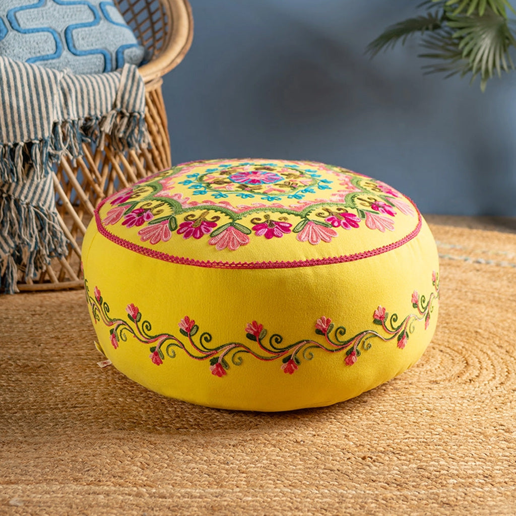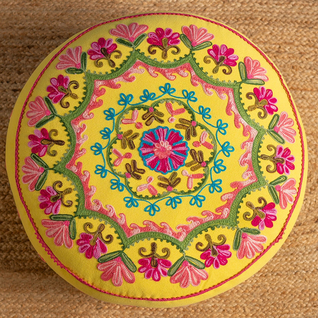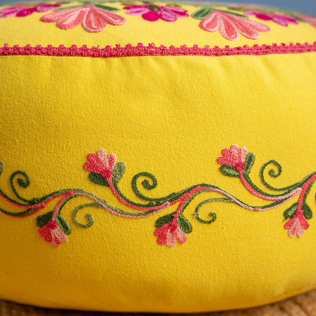 As vibrant as it is elegant, this beautiful hand-embroidered pouffe features a floral, almost mandala style, design on the top and flowing pattern on the sides. Embroidered in delicate shades of pink, blue and green that stand out wonderfully against the yellow cotton background, this gorgeous pouffe showcases the wonderful skills and imagination of the artisans who crafted it, and will effortlessly liven up any room