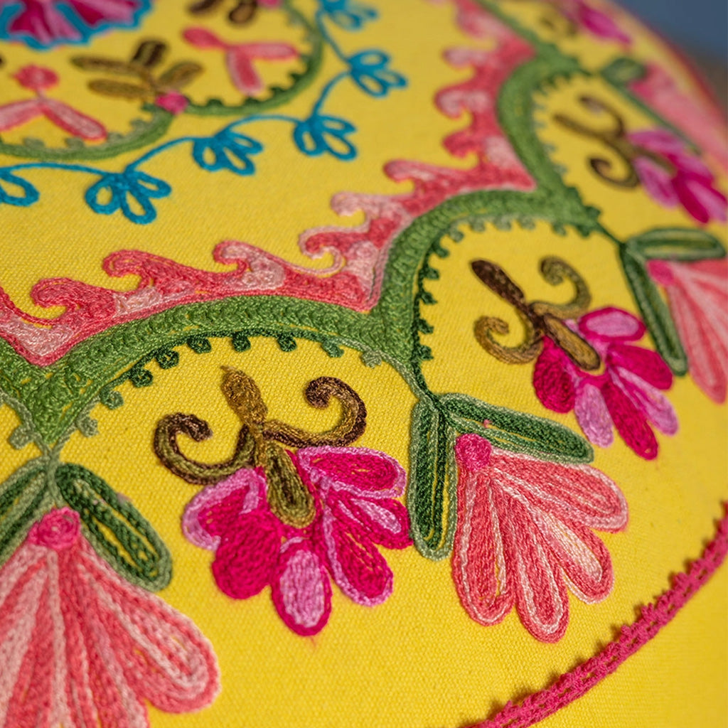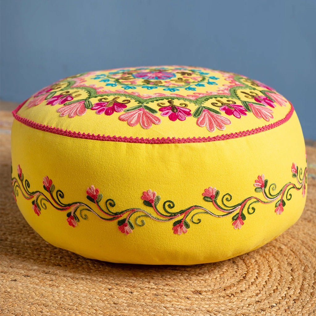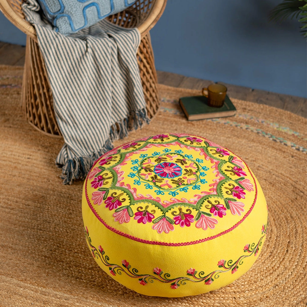 As vibrant as it is elegant, this beautiful hand-embroidered pouffe features a floral, almost mandala style, design on the top and flowing pattern on the sides. Embroidered in delicate shades of pink, blue and green that stand out wonderfully against the yellow cotton background, this gorgeous pouffe showcases the wonderful skills and imagination of the artisans who crafted it, and will effortlessly liven up any room
