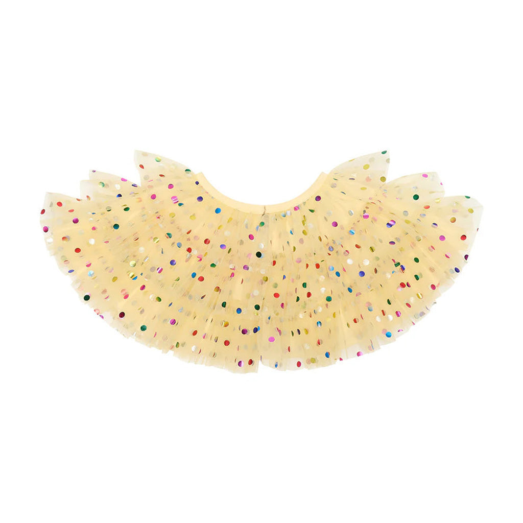 Super cute, pink chiffon cape with multicoloured spots- layers of pretty chiffon frills with a popper fastening