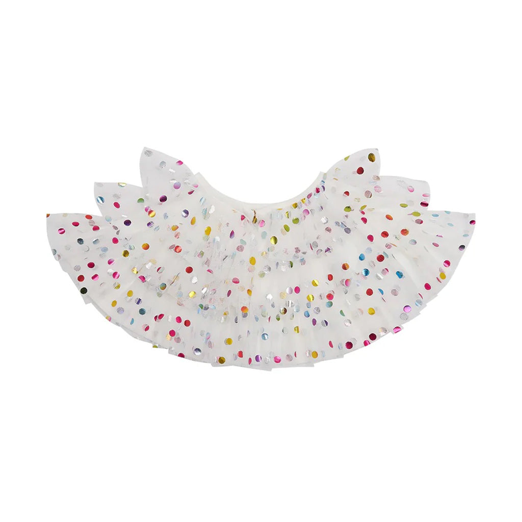 Super cute, white chiffon cape with multicoloured spots- layers of pretty chiffon frills with a popper fastening