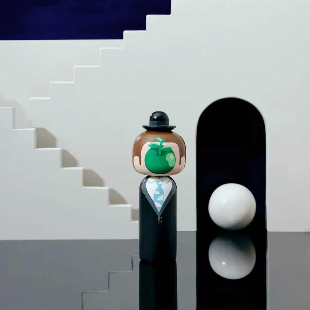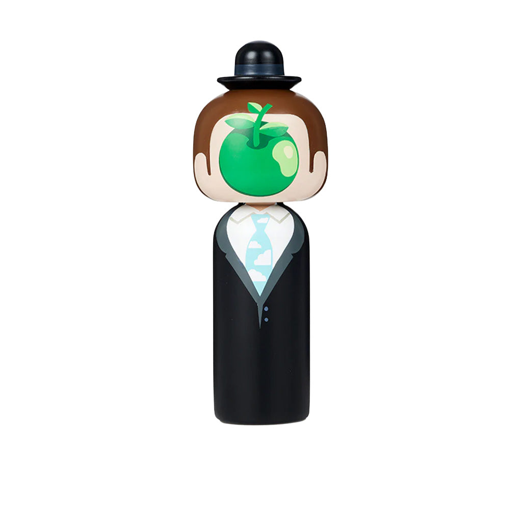 A striking reinterpretation of Magritte’s famous painting The Son of Man, this kokeshi doll features a sleek black suit, a cloud-patterned tie, and the iconic bowler hat. Most notably, the face is obscured by a vivid green apple, reflecting the artist’s signature themes of mystery, illusion, and perception