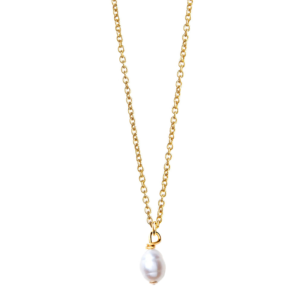 A tumbled round freshwater white pearl floats delicately on a fine gold chain. Since ancient times, pearls have served as powerful symbols of loyalty and integrity. A breezy, modern statement on its own, or team with other necklaces and pendants