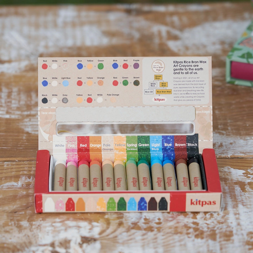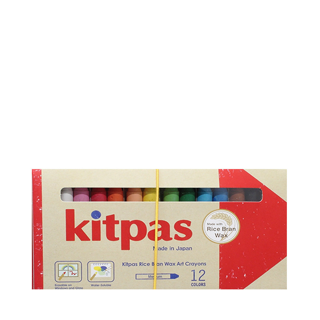 Made with rice bran wax, derived from the bran layer of pure Japanese rice. Each crayon is carefully manufactured by hand in the Kitpas factory in Japan. This set includes 12 colours that are buttery smooth and draw