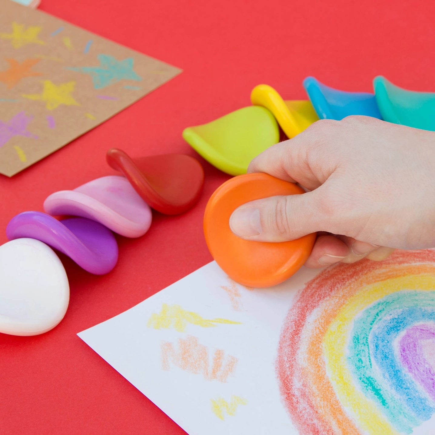 A tub of ten essential colours crayons for creative scribbling, doodling and drawing. Easy grip for kids to grasp and ergonomically designed for little hands. Encourage kids to make their mark in their favourite colours