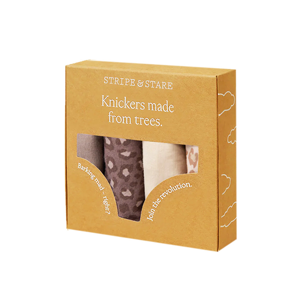 Extra feminine and extra comfortable, the original cloud-soft, breathable knicker in a 4x Pack in LEOPARD print finished with lace trim and packaged with love in a gift box