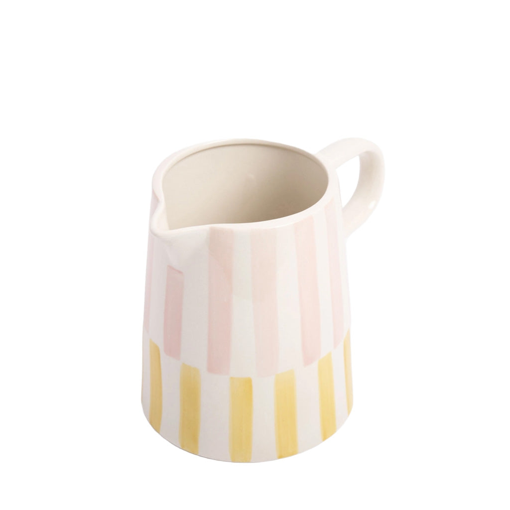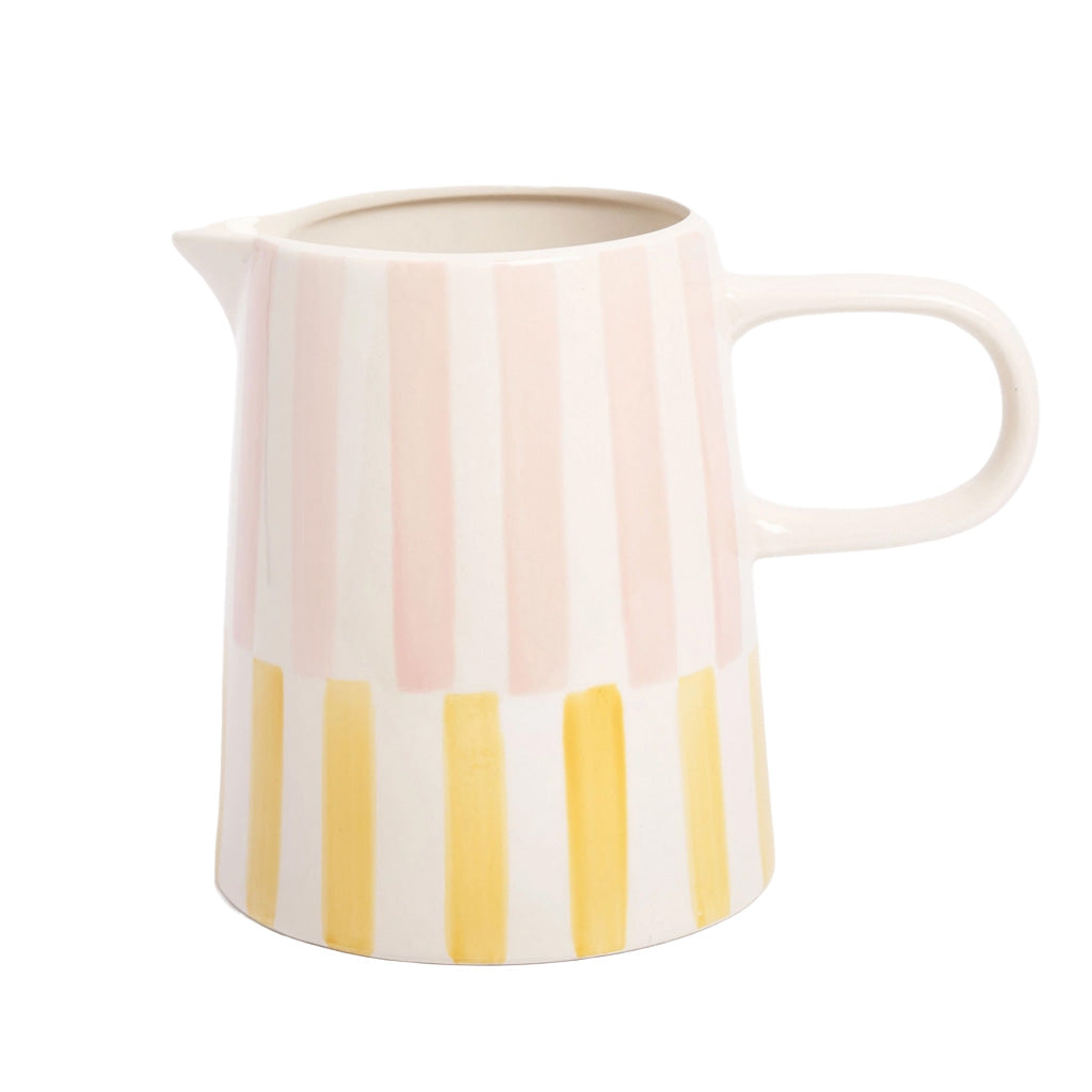 This beautiful hand-painted glazed stoneware jug with an elongated handle comes in a colourful and pretty pink and yellow offset stripe design
