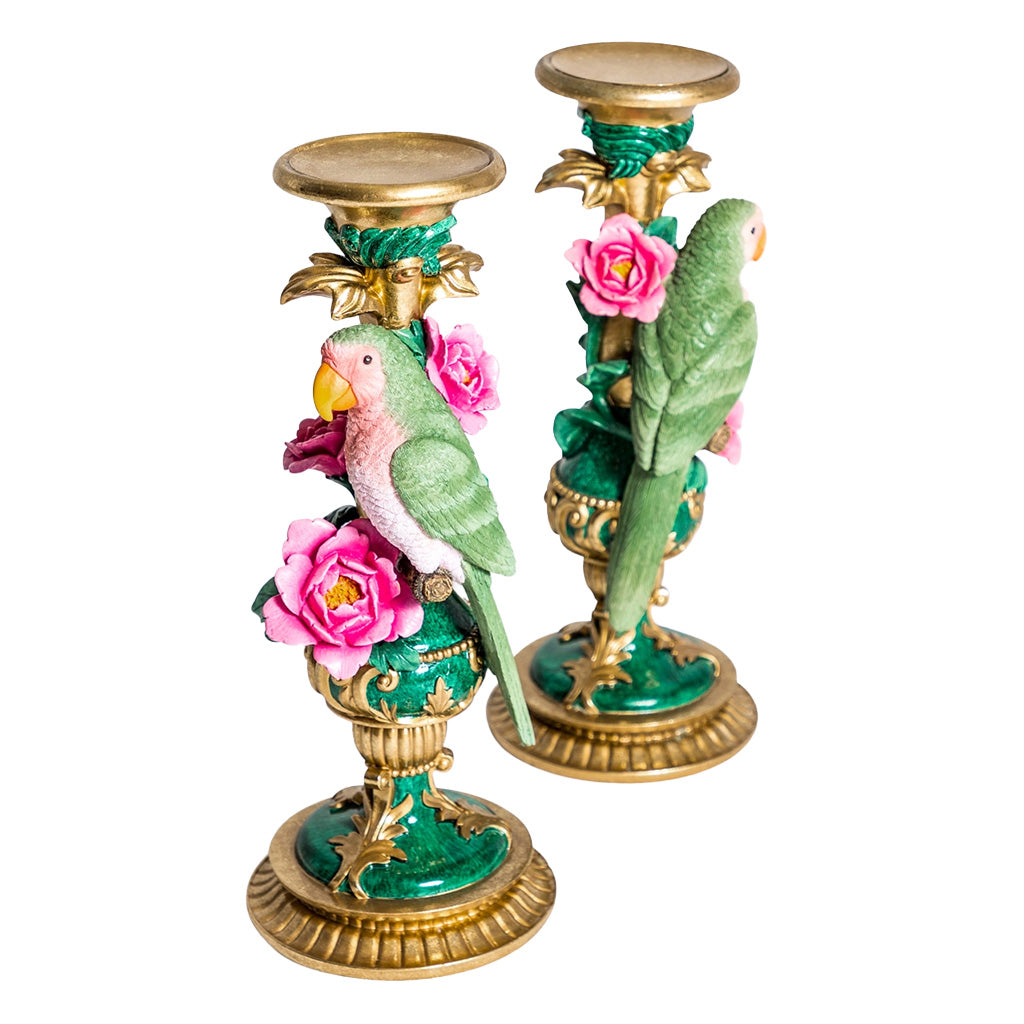 This beautifully pair of handcrafted parrot candle holders features vibrant green parrots perched gracefully amidst lush, sculpted roses, creating a tropical baroque ambiance ideal for any curated space and perfect for adding a spot of whimsical charm to any interior