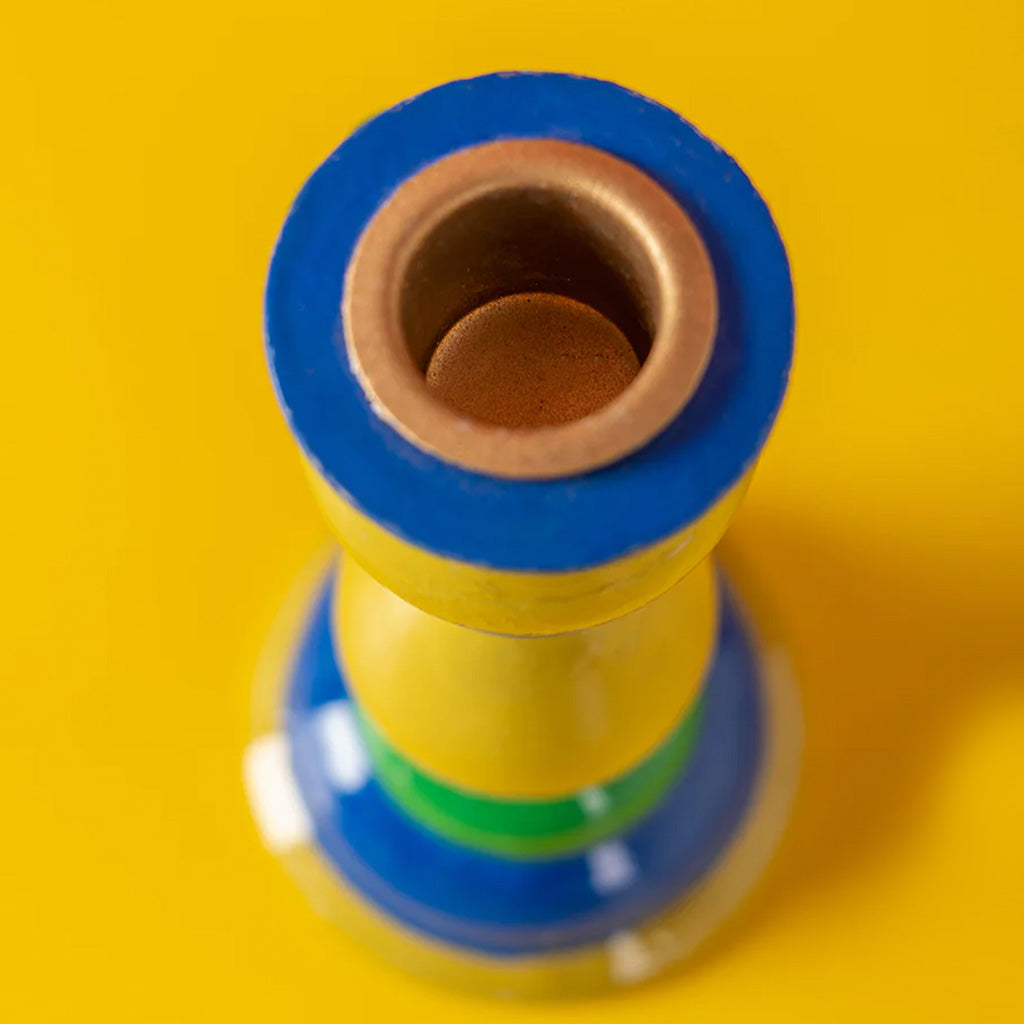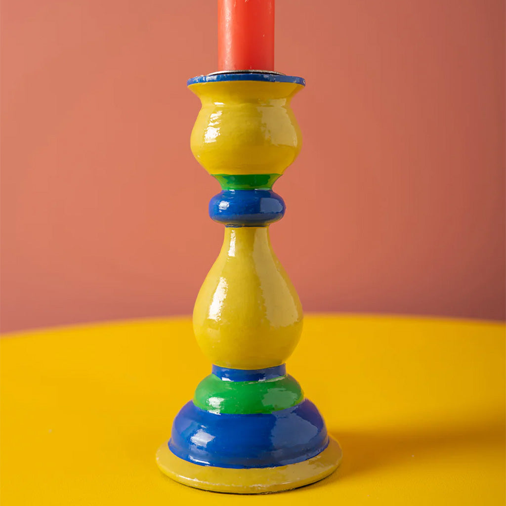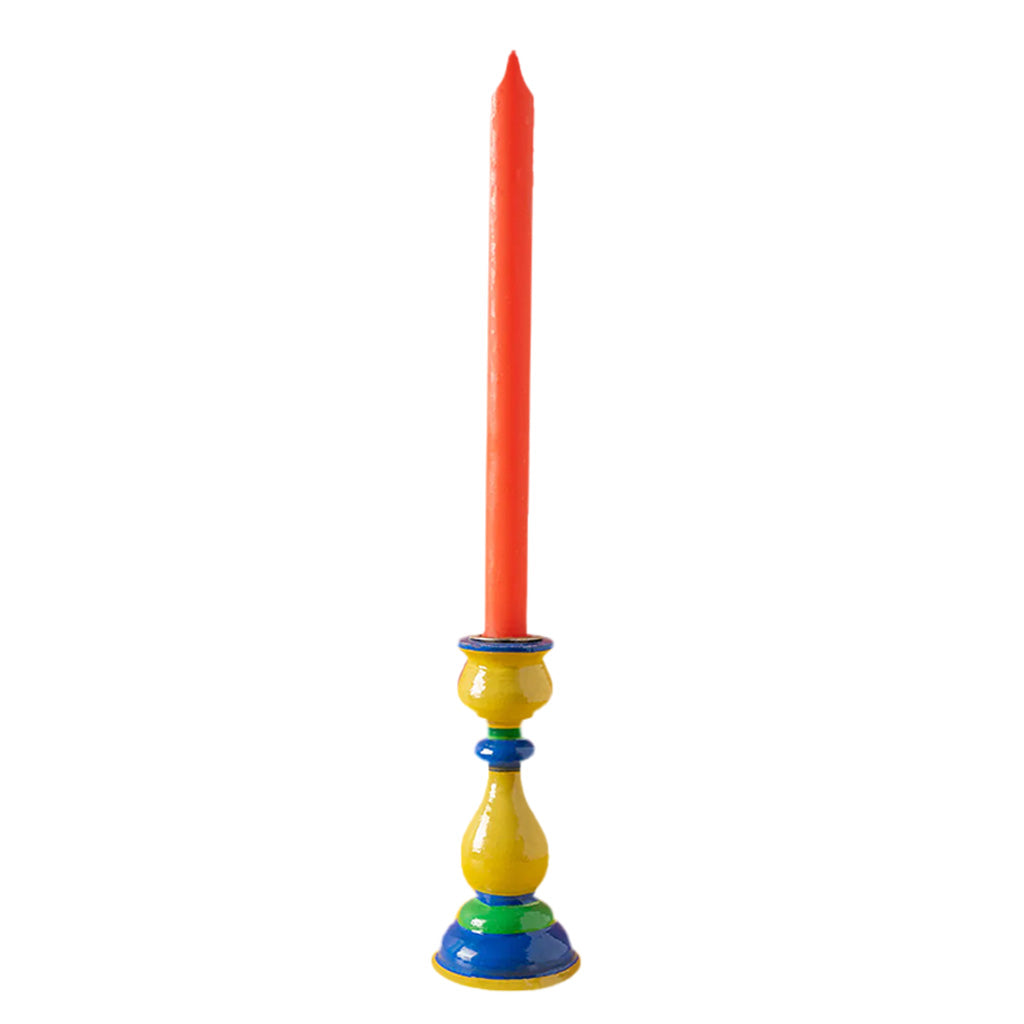 This wooden candleholder was expertly hand carved in the Kashmir region of IndiaBeautifully hand painted in a parade of colours, its superb curvy, fluid shape creates an effortlessly elegant candle holder, fit for any table and any occasionPair with the different designs, mix and match, grouped or individual, it will add a little charm to any décor