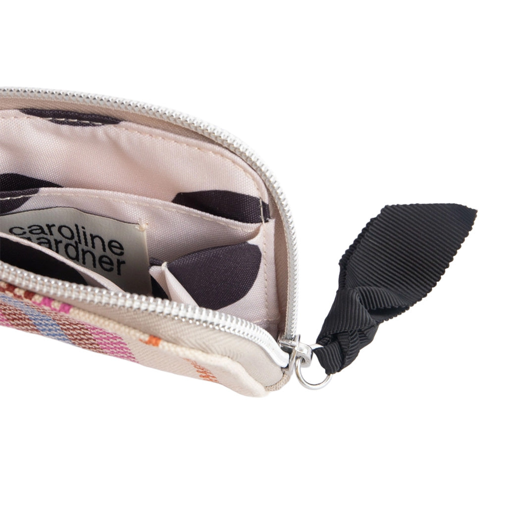 This compact purse boasts a checkerboard stripe print that's sure to turn heads. But it's not all about looks – this purse is designed for convenience too. The ultra-compact size fits seamlessly in to pockets or handbag, while the secure zip closure keeps belongings safe. Internal pockets help organise most-used credit cards, loyalty cards, or gift cards, and the contrasting lining makes finding what you need a breeze