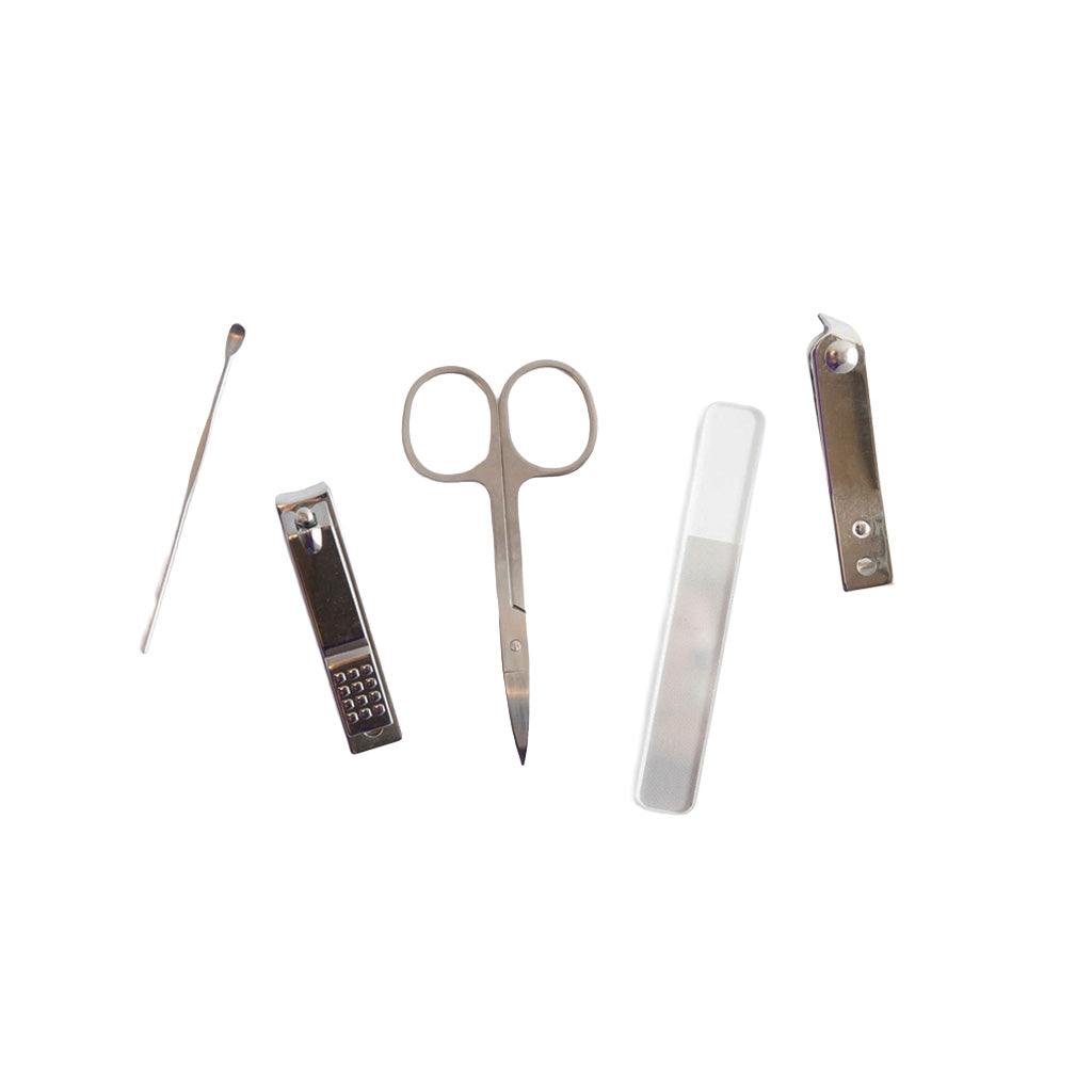 A handy manicure set including nail clippers, precision scissors, a glass nail file, and a versatile cuticle toolDesigned to deliver impeccable grooming results, this set combines style and functionality in a oversized flower print