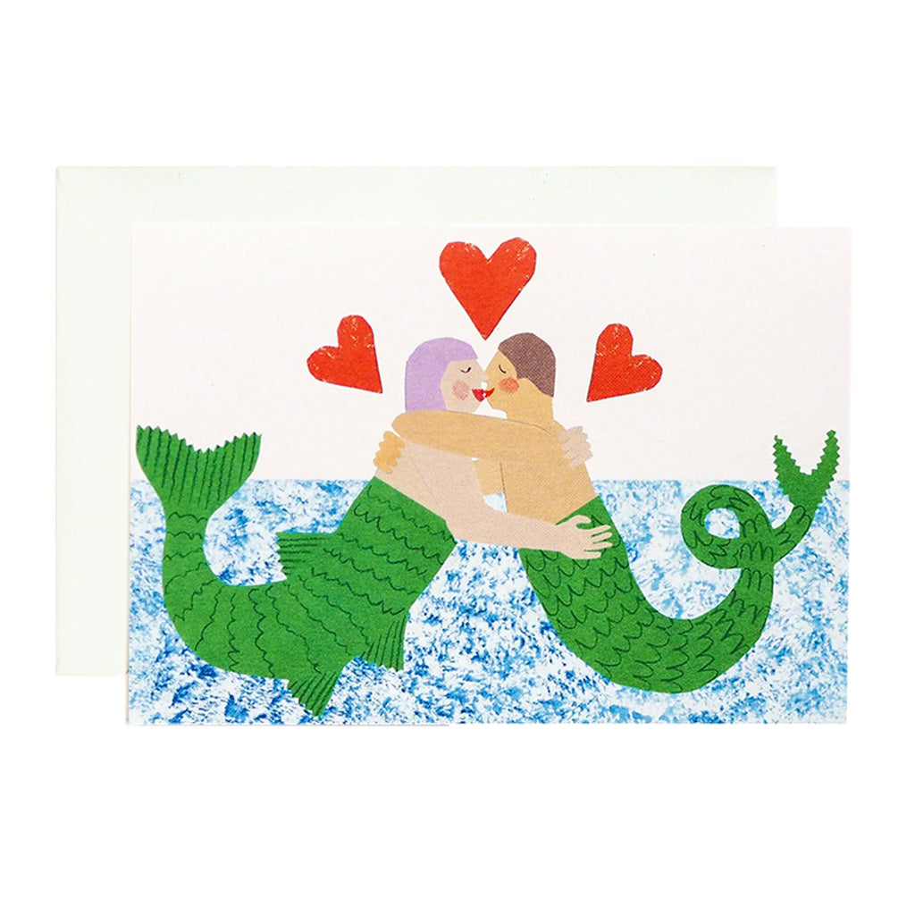 This mermaids greeting card features two simple merpeople, embracing in the sea Comes with an ivory coloured envelope and left blank inside for your own message