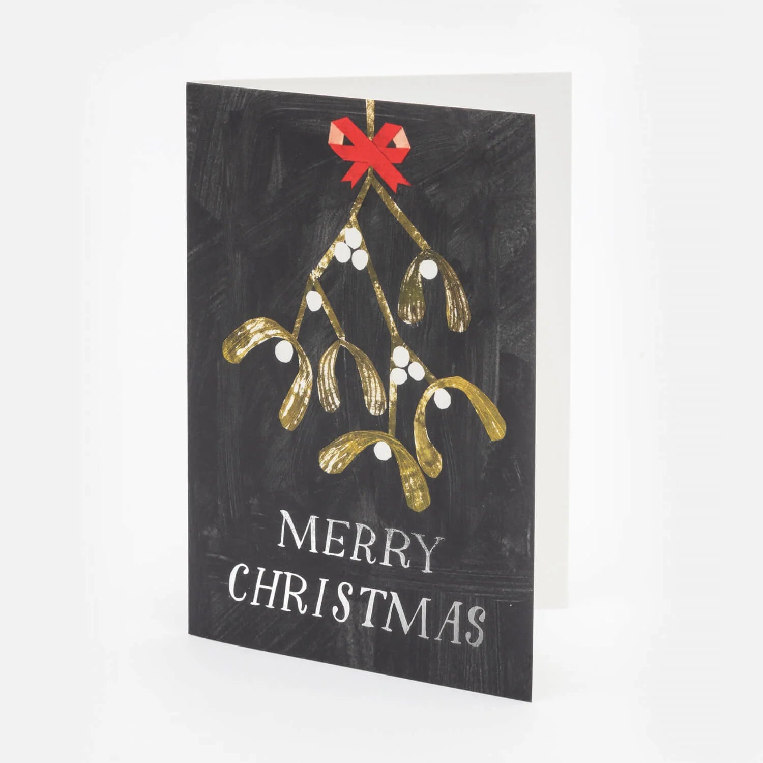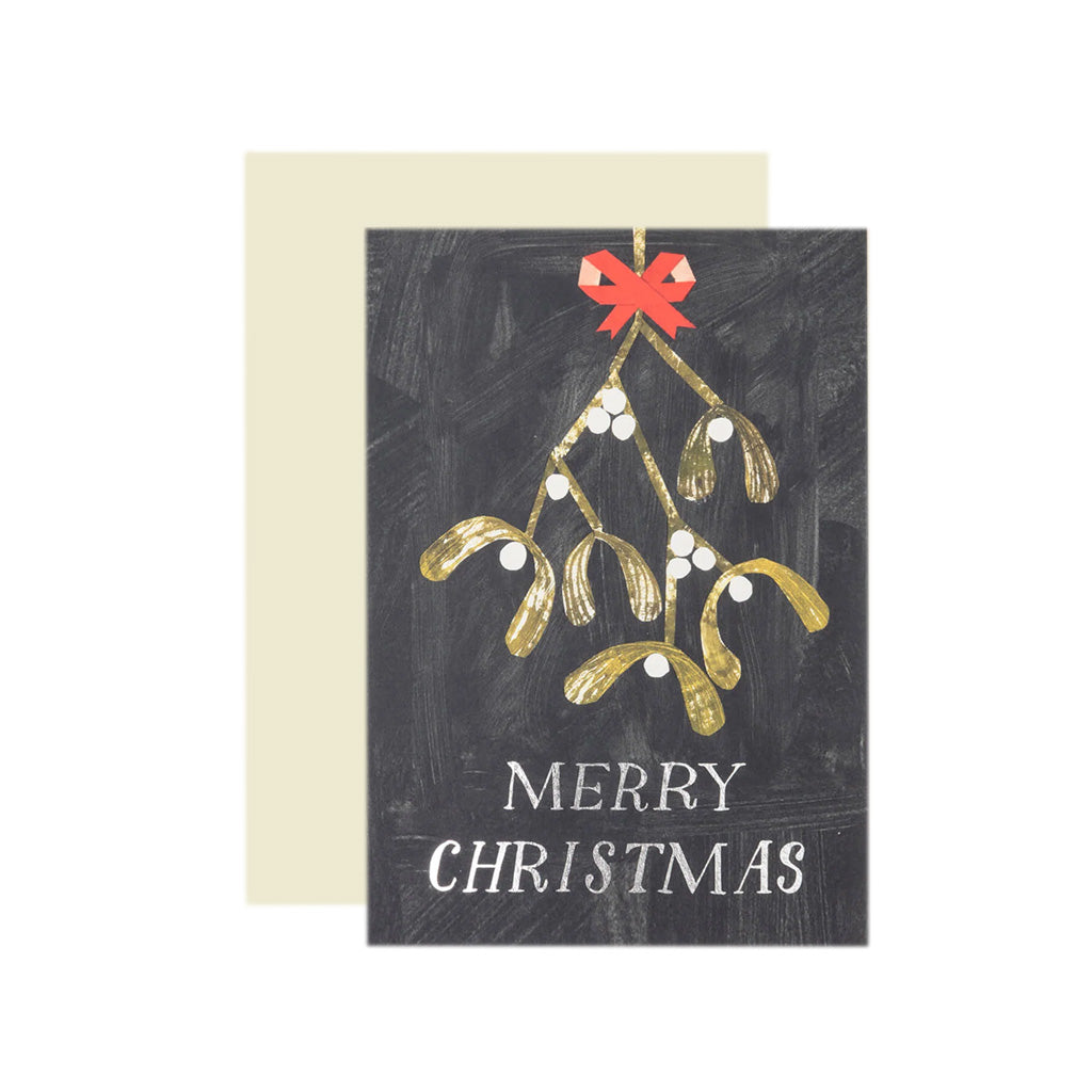 This mistletoe card features contrasting bold colours, stylised lettering and a cheeky collaged piece of mistletoe. A unique and beautiful design that will stand out in any Christmas display and make a wonderful feature on a mantelpiece