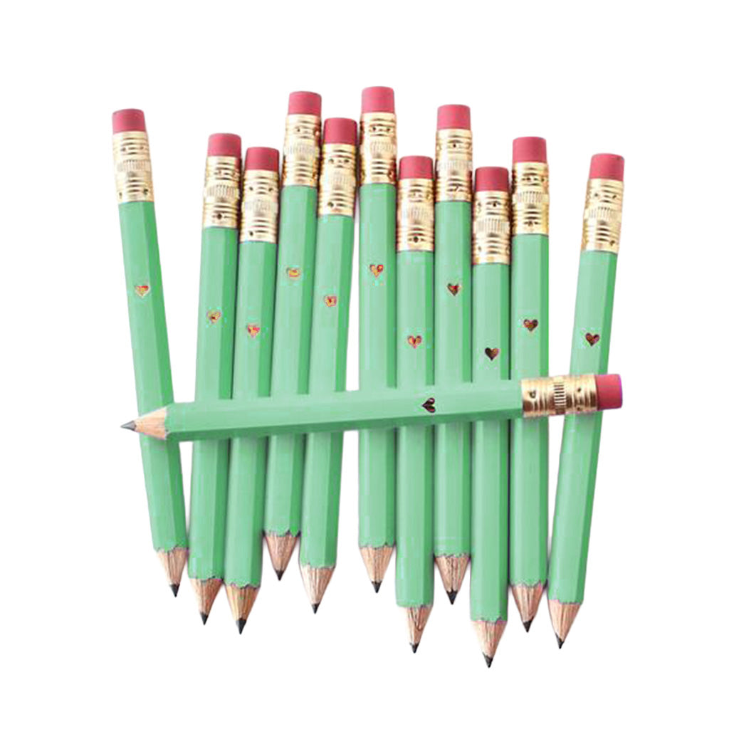 A set of 12 sweet mini pencils stamped with the tiniest foil-imprinted gold hearts, with a classic gold ferrule and pink eraser top