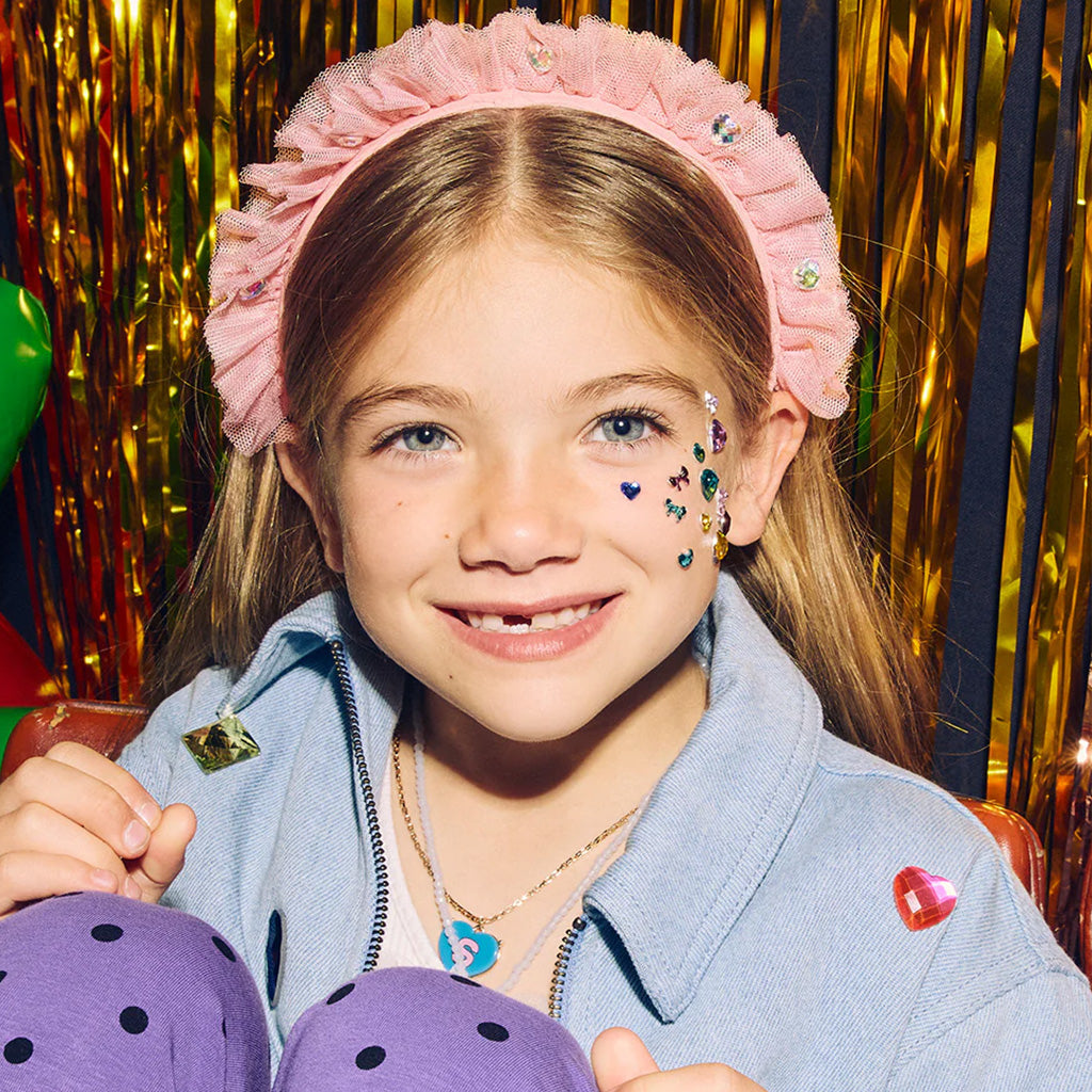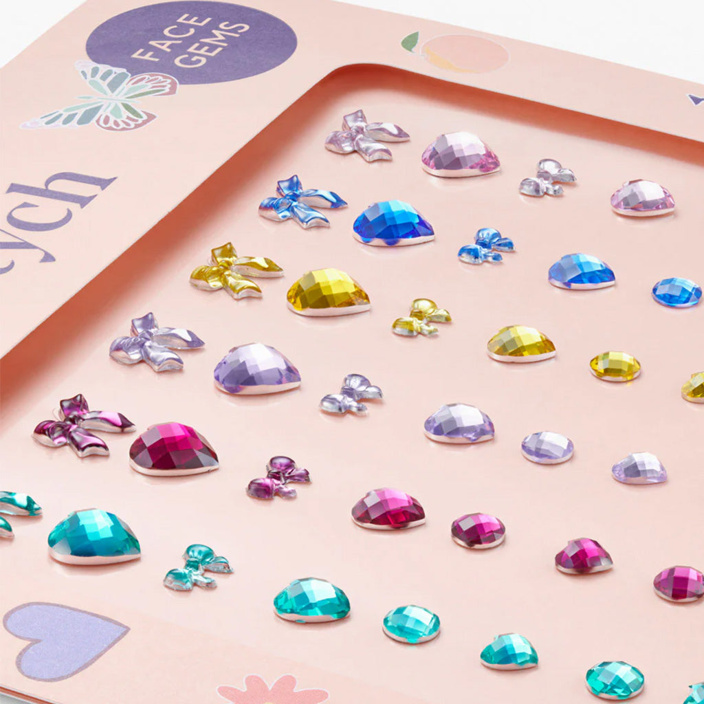 Pack of 48 bright glittering face gems, including hearts, bows and gems