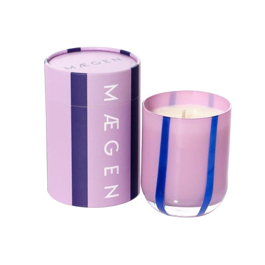 The vibrant, striped, colourful glass vessel is filled with the gorgeous scents of blackcurrant and oud in a beautiful soy wax candle