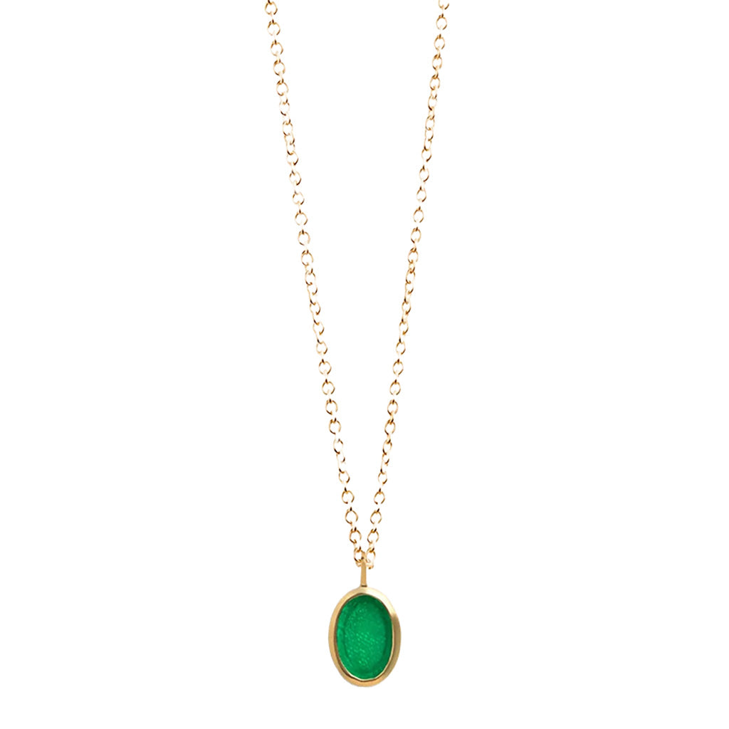 Borrowing its shape from a vintage looking glass, an oval pendant of subtle brushed gold surrounds a slice of bright green onyx. Optimistic and versatile, this piece is as striking worn alone as is it in a layered look