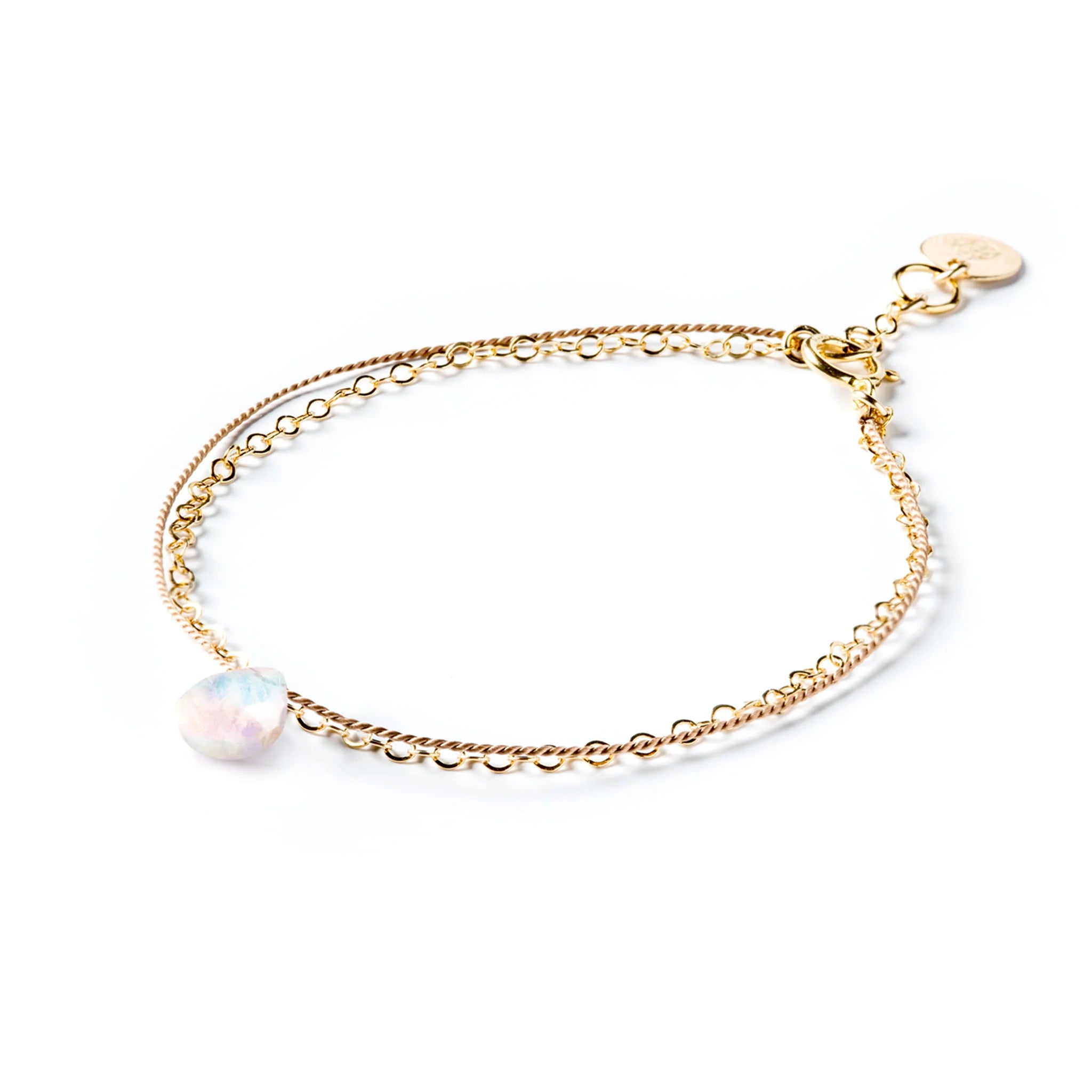 A minimalist 14k gold fill birthstone bracelet with silk cord, featuring a rainbow moonstone gemstone in a signature faceted shape
