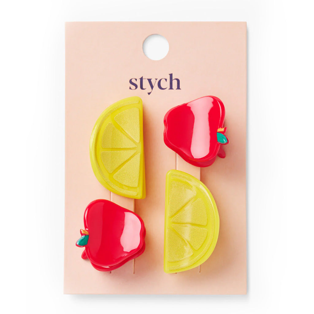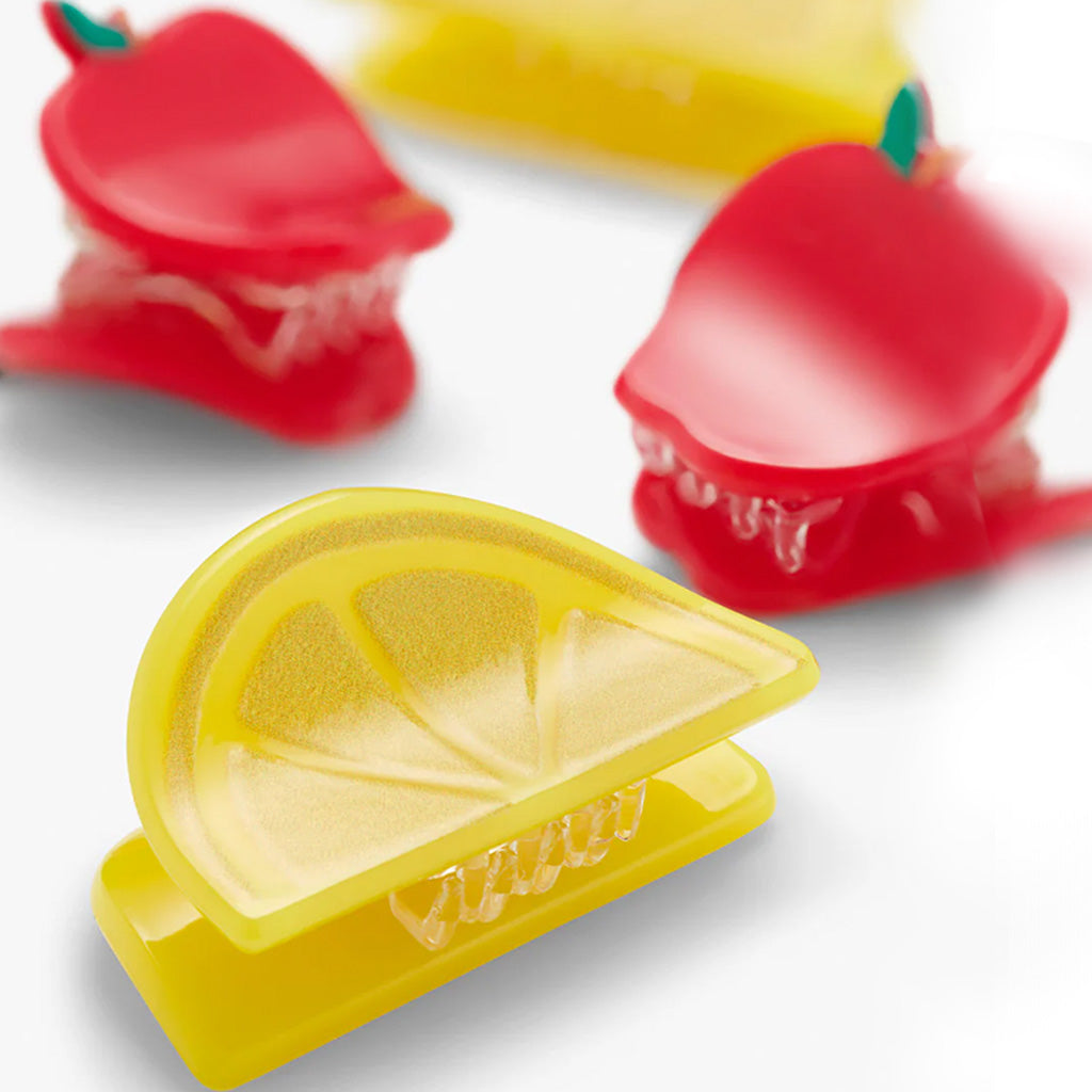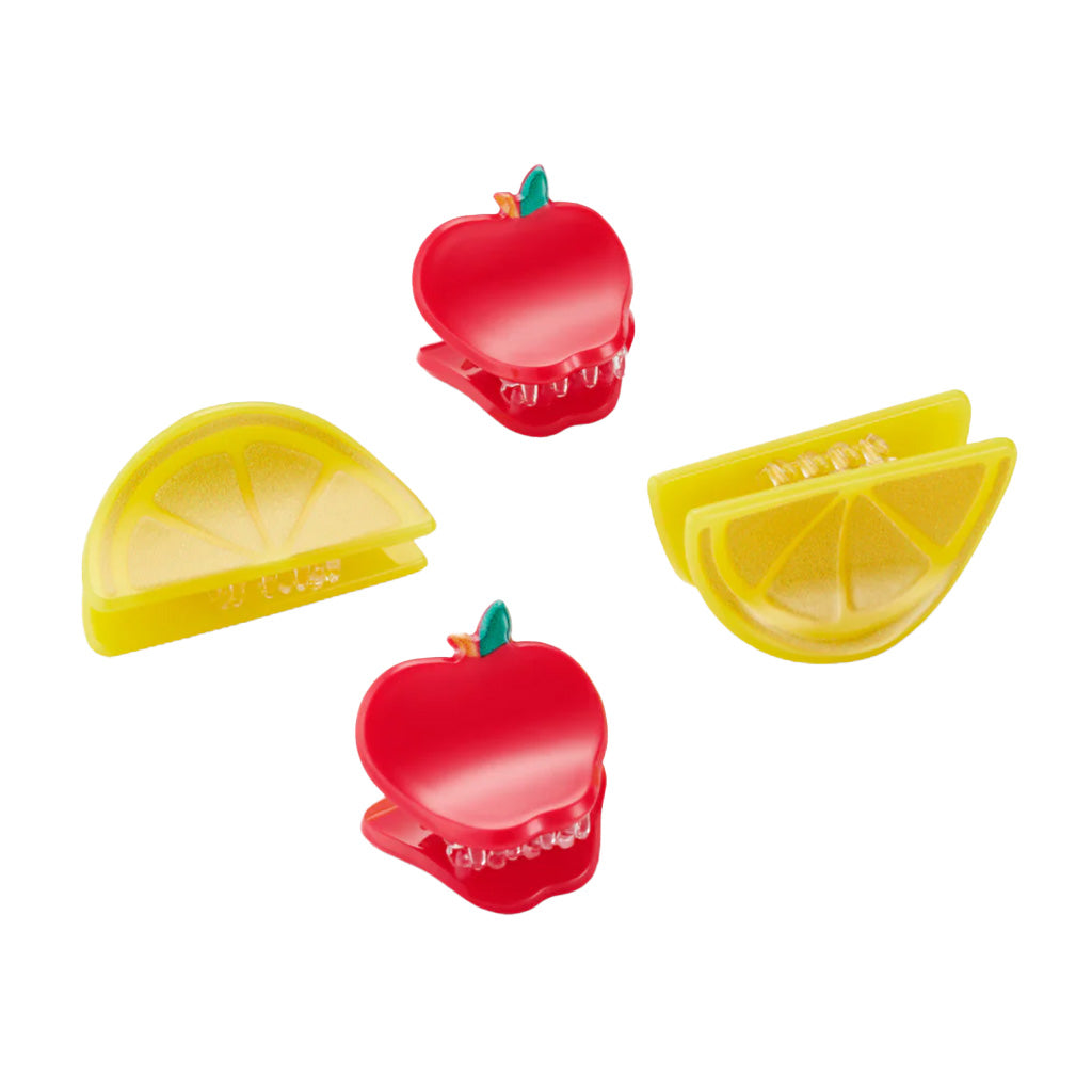 A pack of four glossy hair claw clips in lemon and apple shapes
