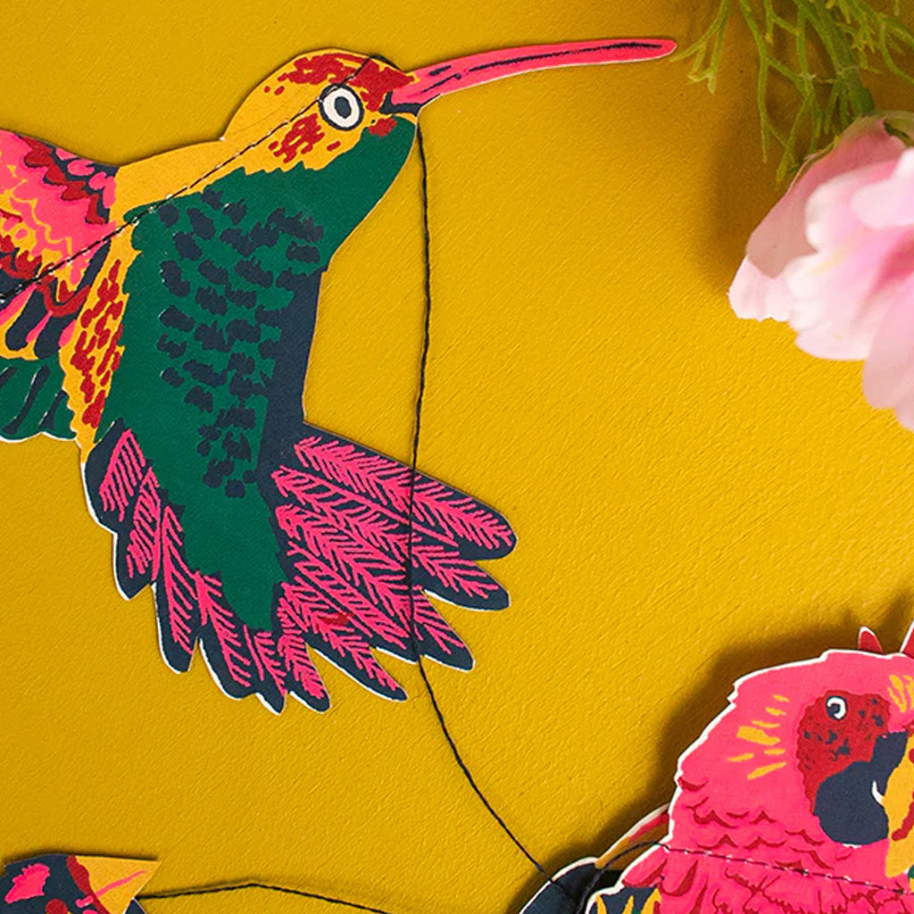 Inspired by tropical rainforests, this garland features richly colourful birds including humming birds, parrots, cockatiels and toucansTen shapes sown across strong cotton thread, made entirely from recycled materials