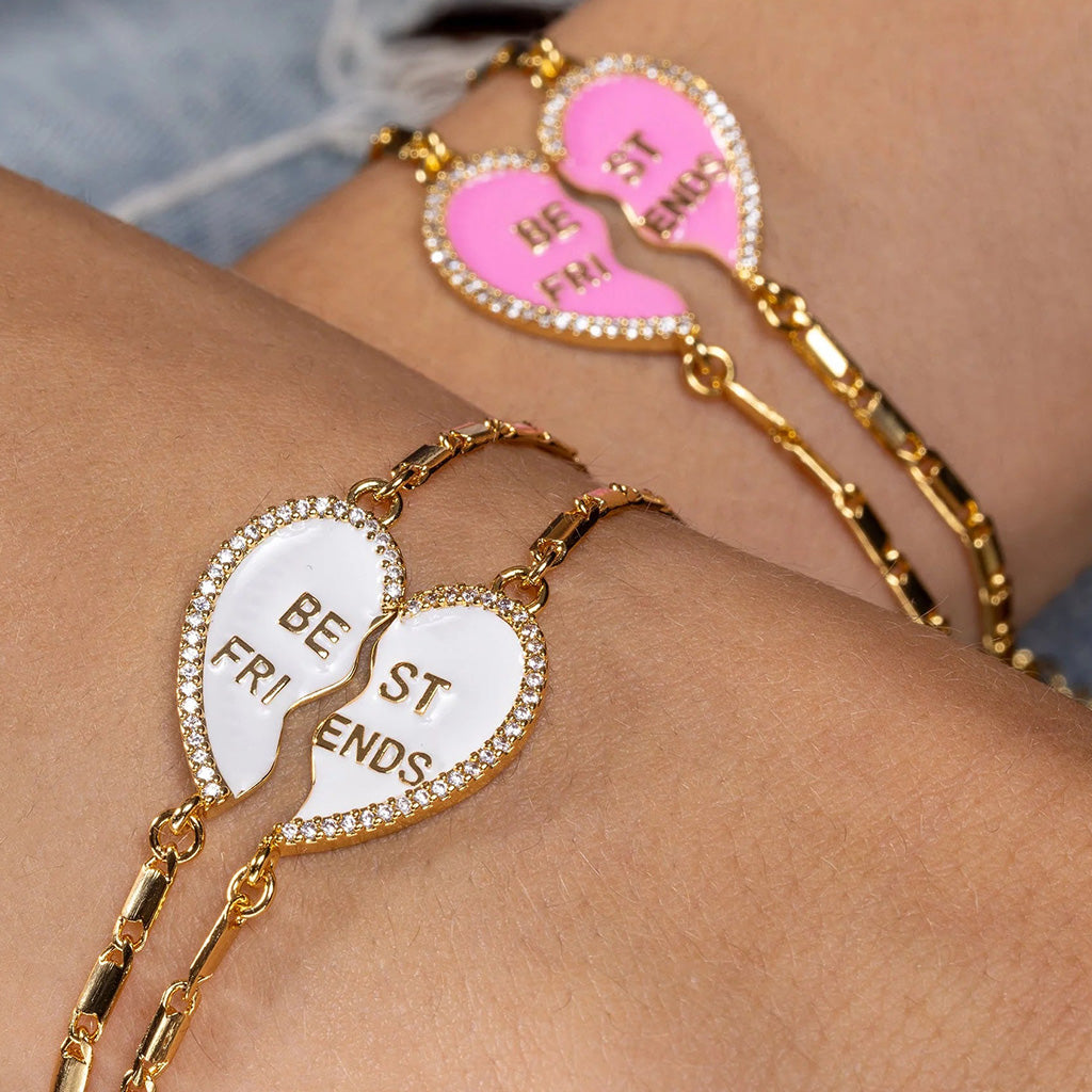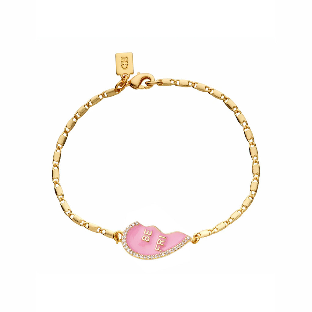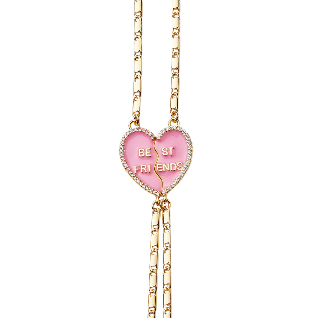 Crafted from 18k gold plated brass with two enamelled half-hearts, cubic zirconia borders, Best Friends lettering and finished with lobster clasps and engraved logo tag