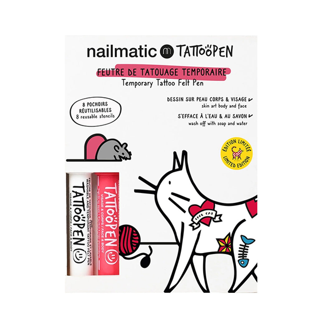 A kit of two temporary 'tattoopen' markers, one red and one white, and a sheet of 7 reusable, cat themed stencils Great for bath time fun, cool kid parties or budding artists. Easily removable with soap and water
