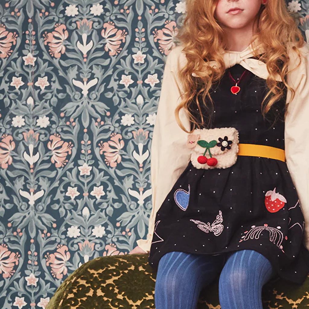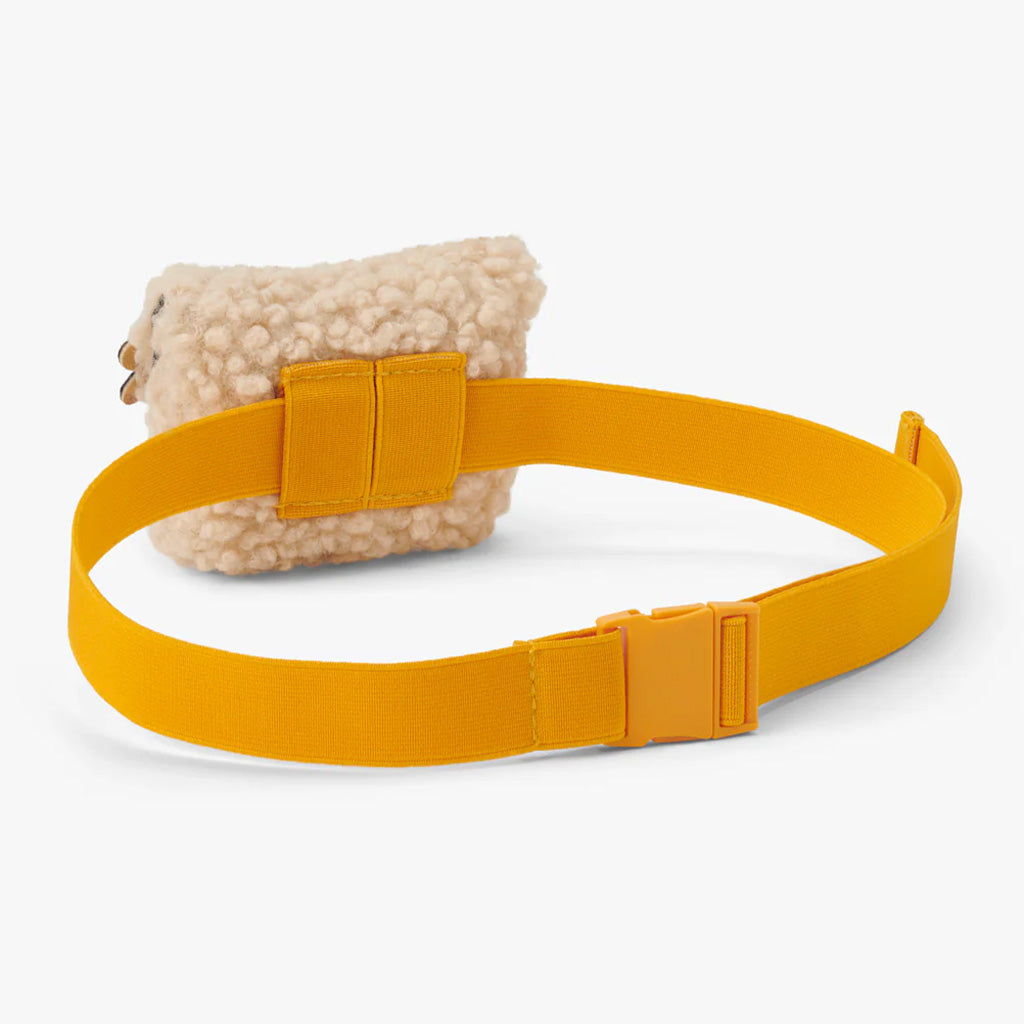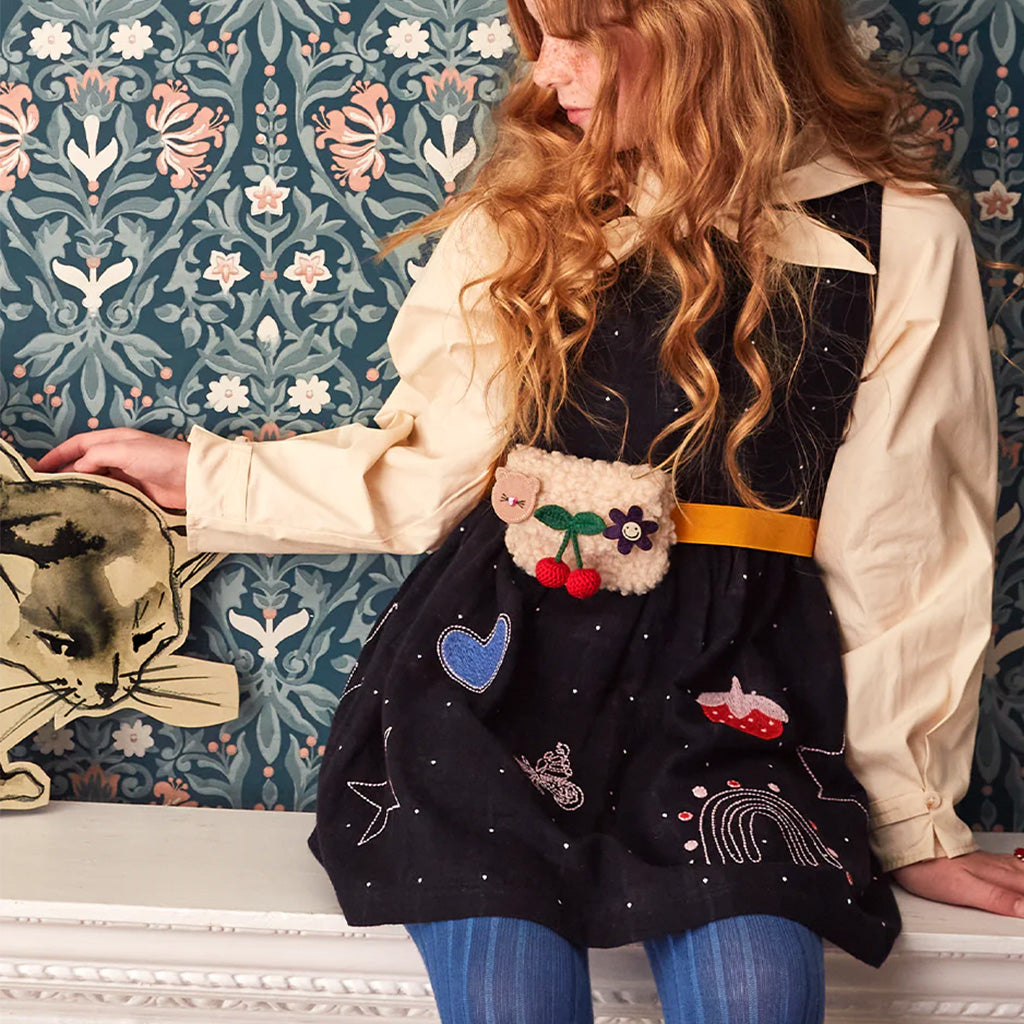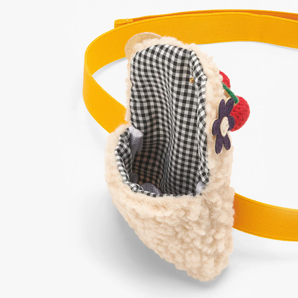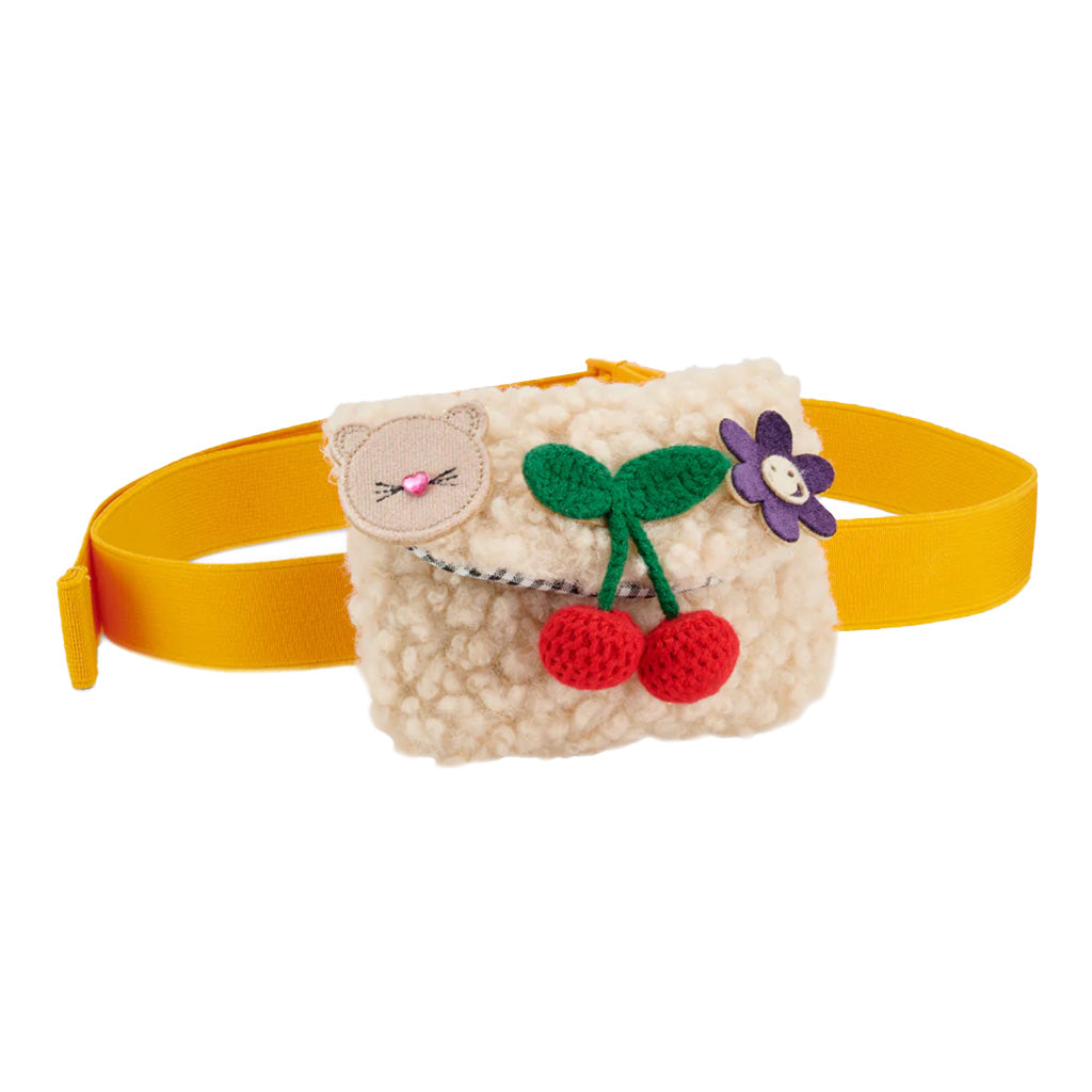 Fluffy borg purse with crocheted cherries and patch appliqué characters, on a elasticated clip belt