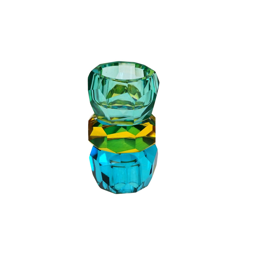Double-ended, coloured glass candle holder that can be used either end. One end for tapered dining candles the other for tea lights