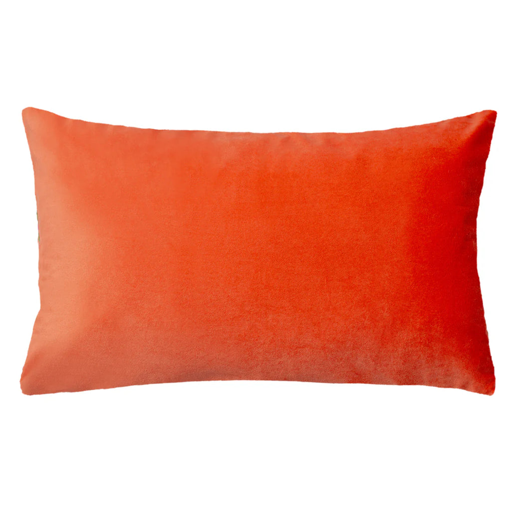 Featuring a orange pink coloured velvet back, this cushion is also reversible. Add to your sofa for the ultimate statement