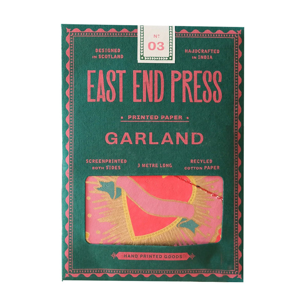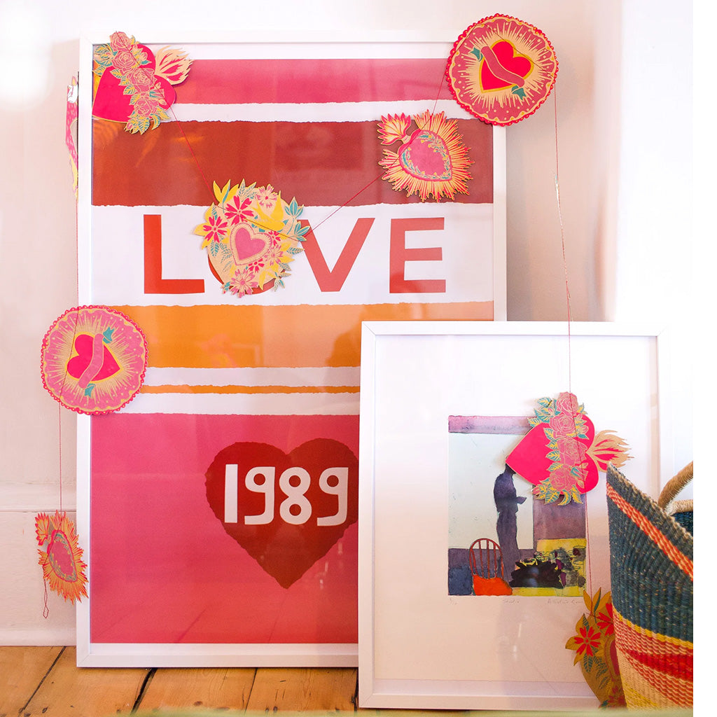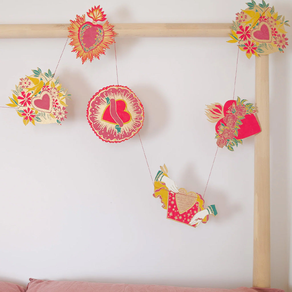 Inspired by scared hearts and Mexican folk art, this garland is full of kitsch and romanceTen shapes sown across strong cotton thread, made entirely from recycled materials