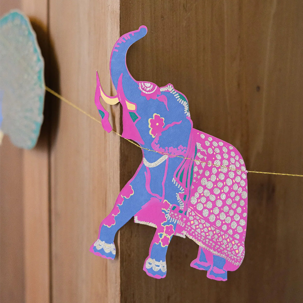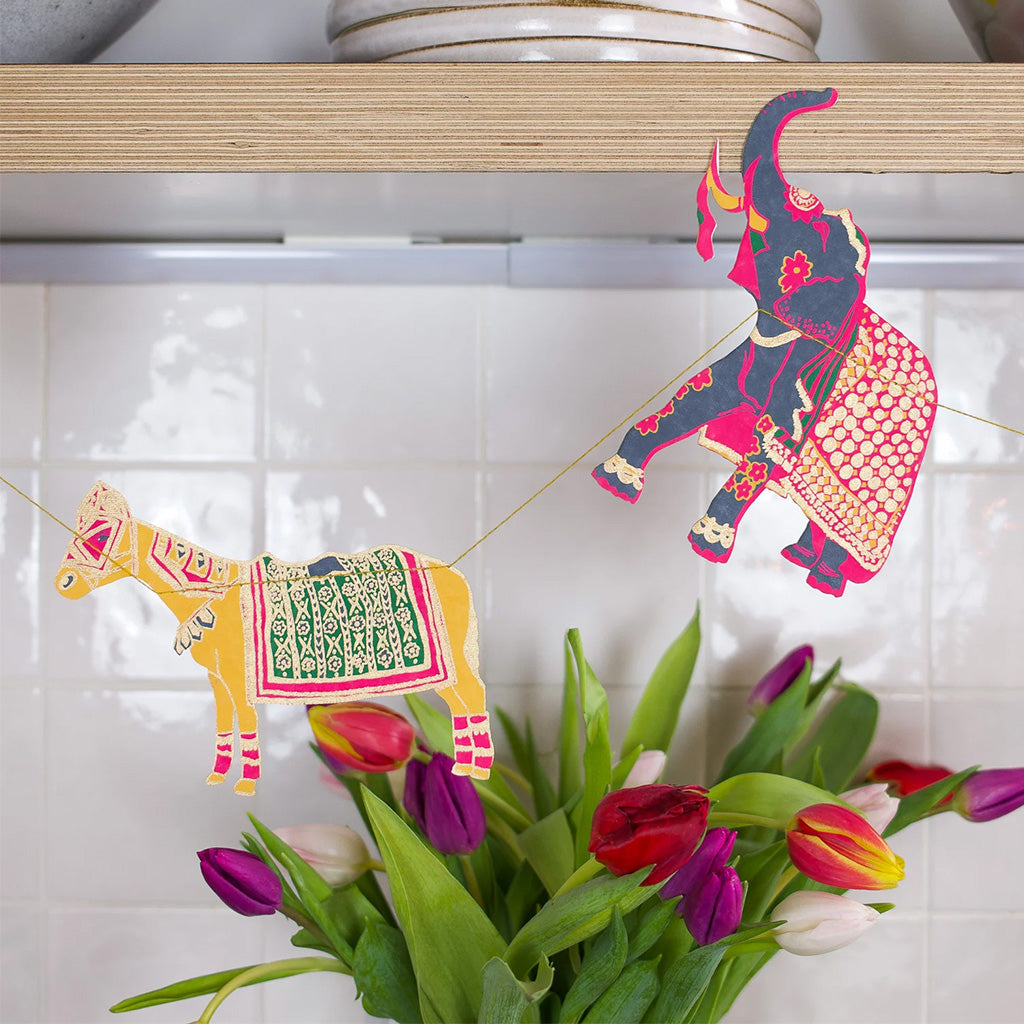 Featuring painted elephants, fancy camels, prancing peacocks and decorated horses; this garland is a menagerie of beautiful Indian animalsTen shapes sown across strong cotton thread, made entirely from recycled materials