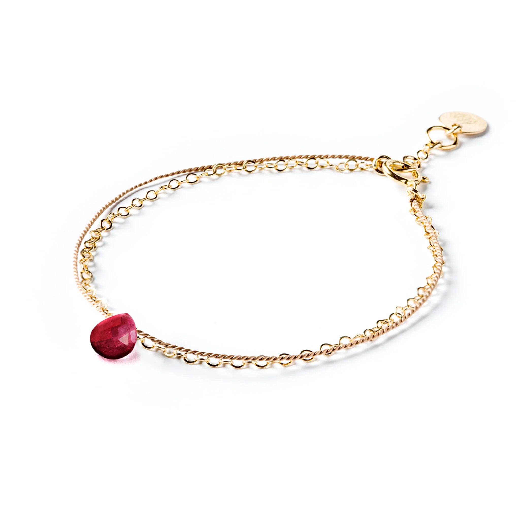A minimalist 14k gold fill birthstone bracelet with silk cord, featuring a ruby gemstone in a signature faceted shape
