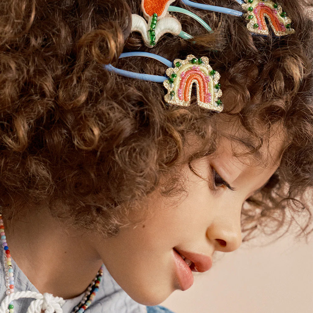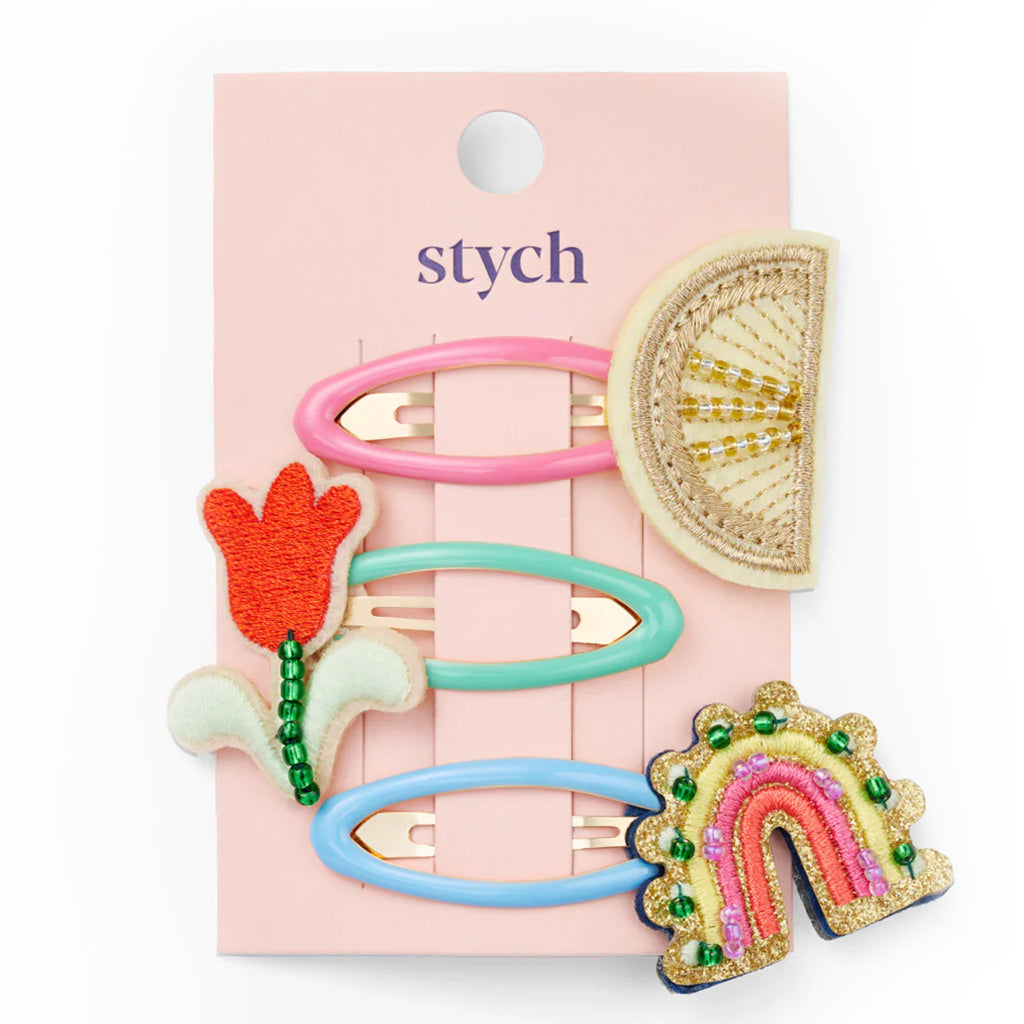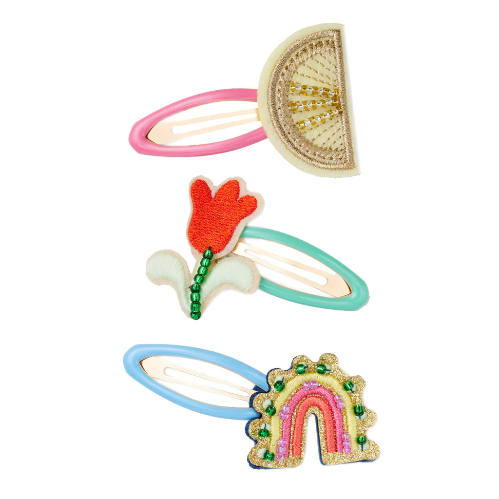A pack of three, icon design hair clips with embroidery and bead appliqué patch detailing