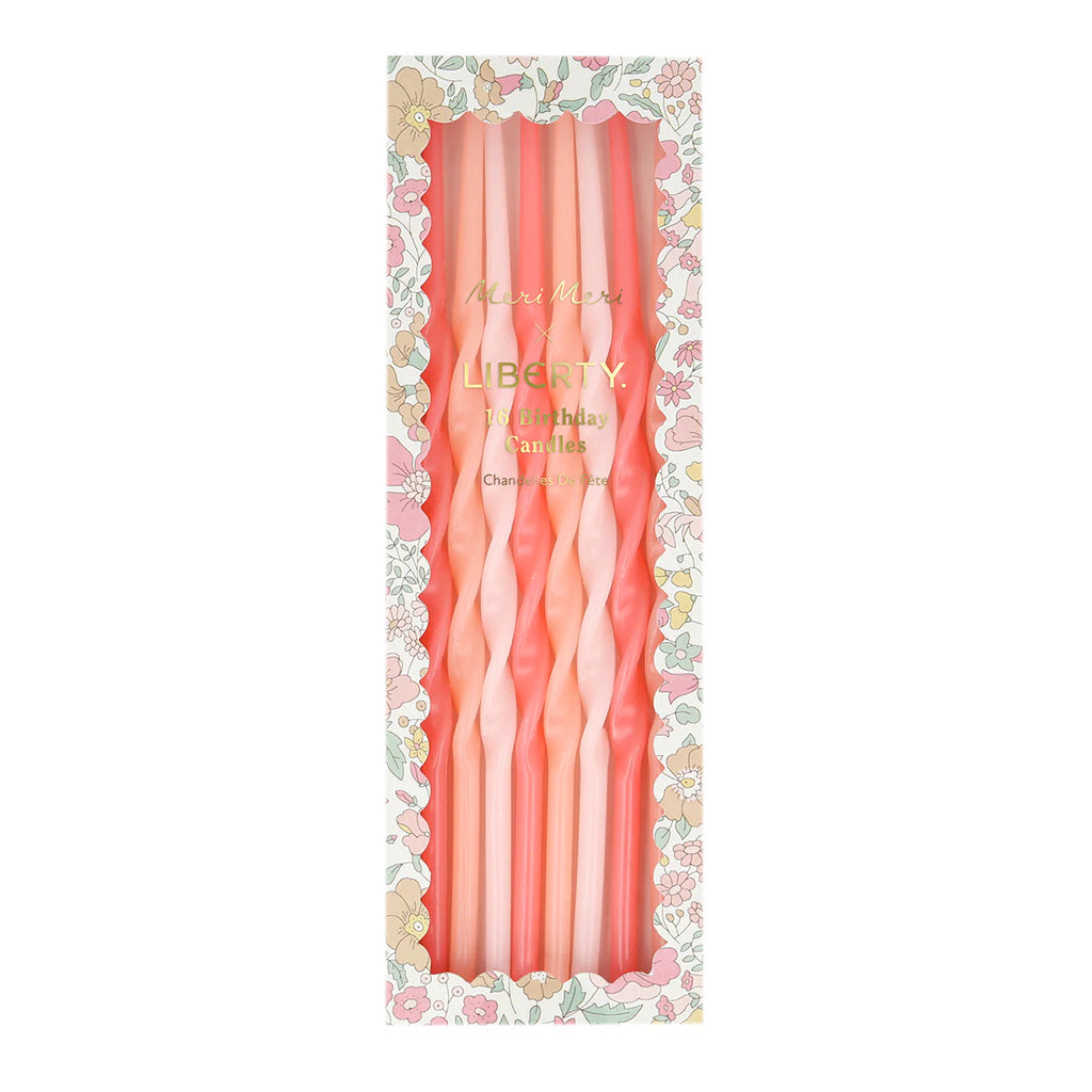 Set an unforgettable scene for your party with this exclusive elegant candle set, crafted in collaboration with Liberty, the iconic London department store. The combination of the twisted shapes, with shades of peach and pink, will instantly add statement to your celebrations. Perfect for any occasion where you want soft pink and peach tones, like a princess or fairy party. These birthday candles are beautifully presented in a matchbox-style box with a Liberty print design