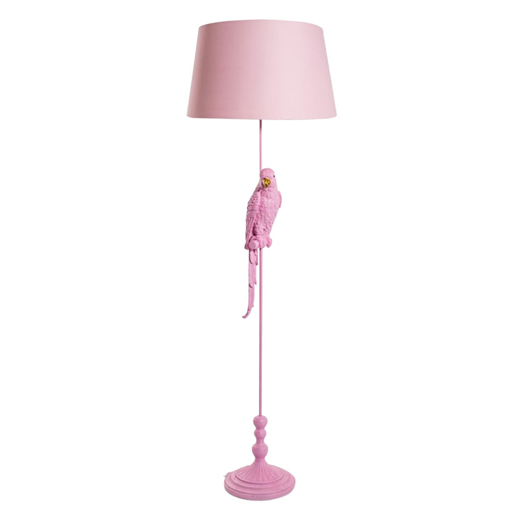 This whimsical pink parrot floor lamp with pink shade combines playful design with expert craftsmanship