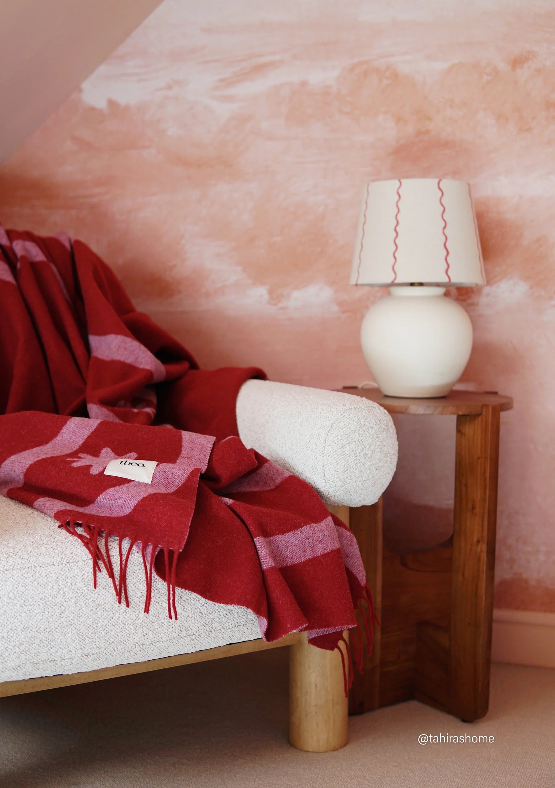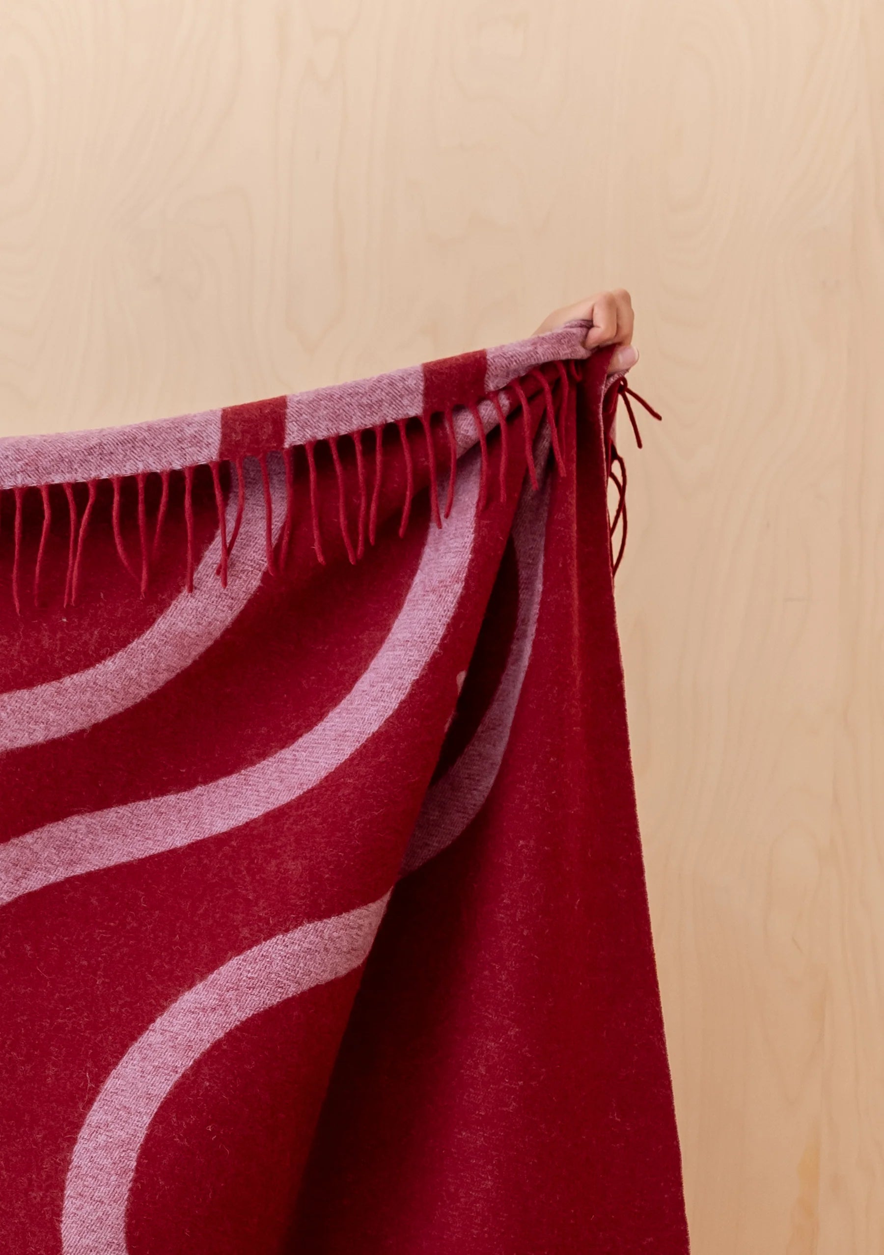 Wrap yourself in the luxurious comfort of this fringed lambswool blanket in a red and rose pink wave jacquard pattern