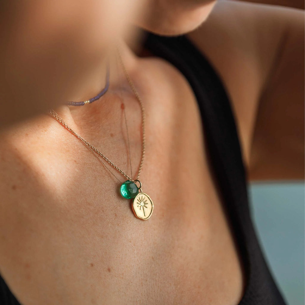 Modern and understated, a solo gemstone slides on a delicate and minimalist fine cord necklace. A piece charged with an effortless, up-for-anything spirit