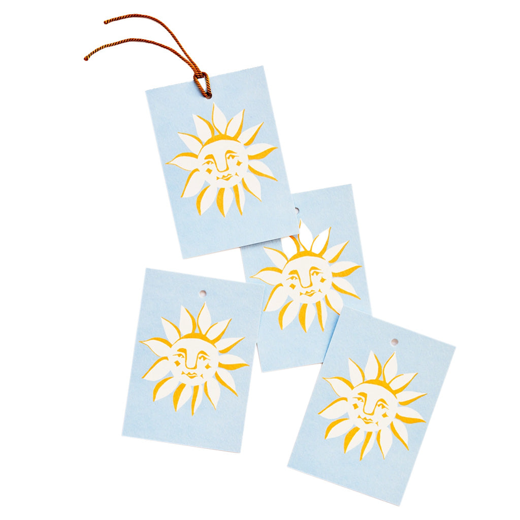 A set of eight blue SUNSHINE gift tags, traditionally printed on FSC certified card