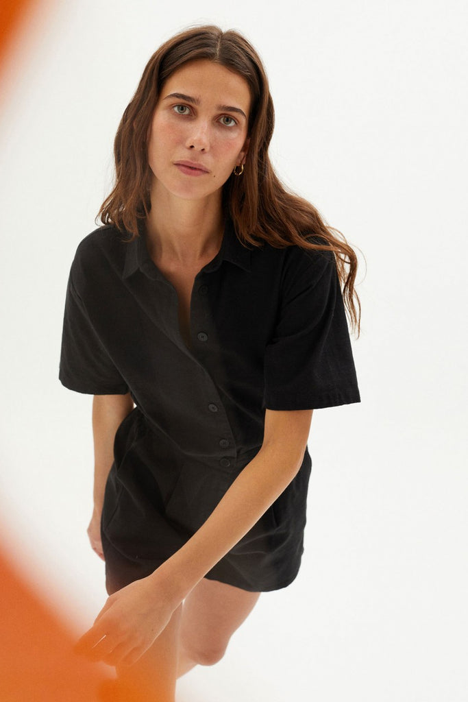 Short jumpsuit with darted shirt style top and wide leg shorts bottom, natural corozo buttons and zip closure
