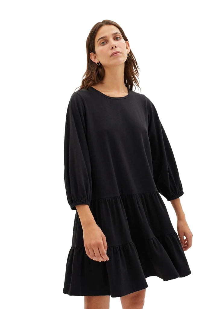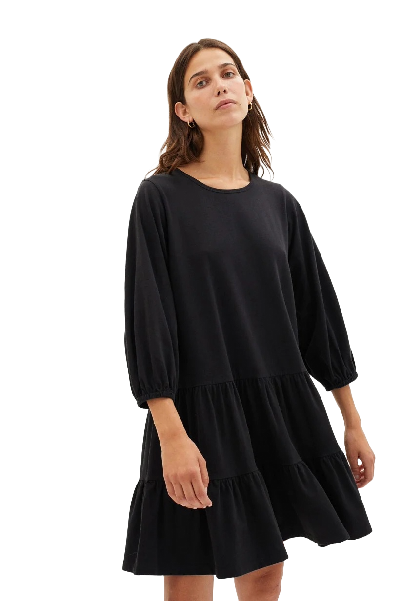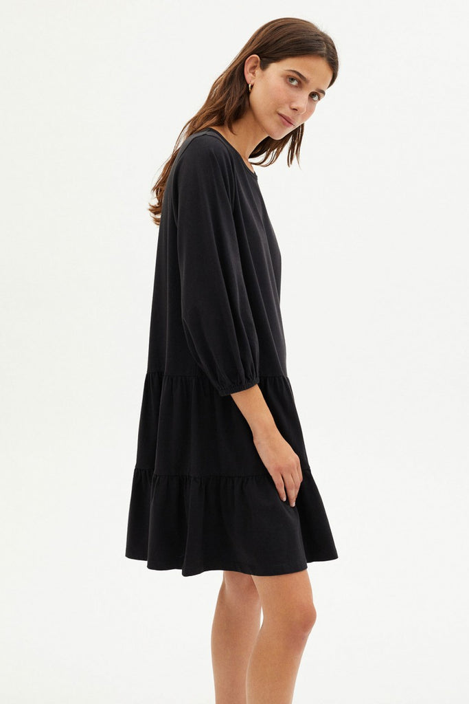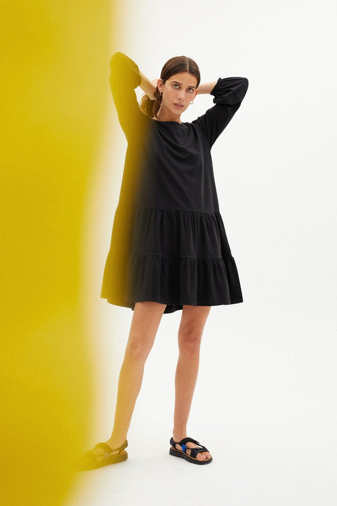 Short dress with round neck and long sleeves with elasticated cuffs, a tiered hem and a buttoned opening at the back