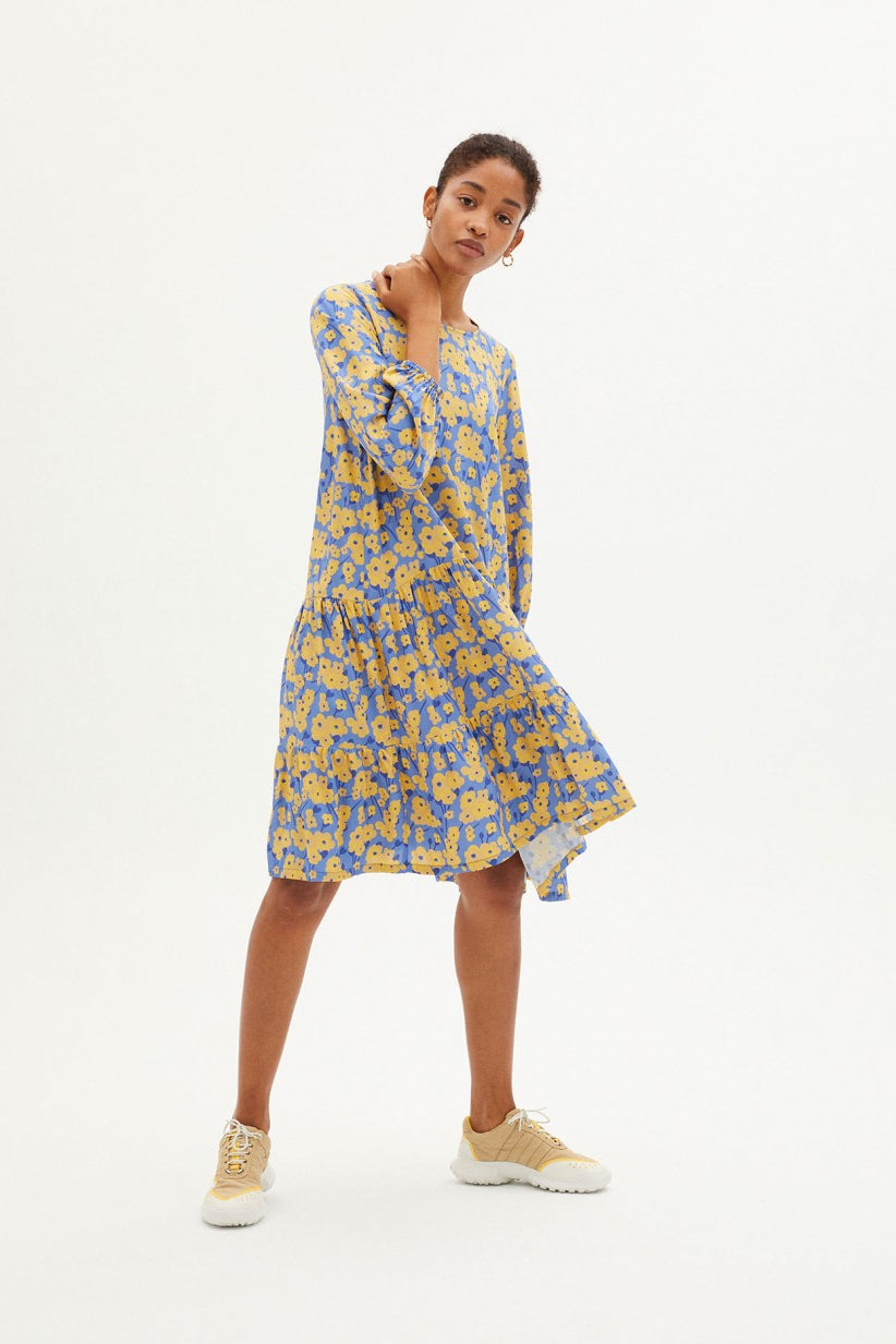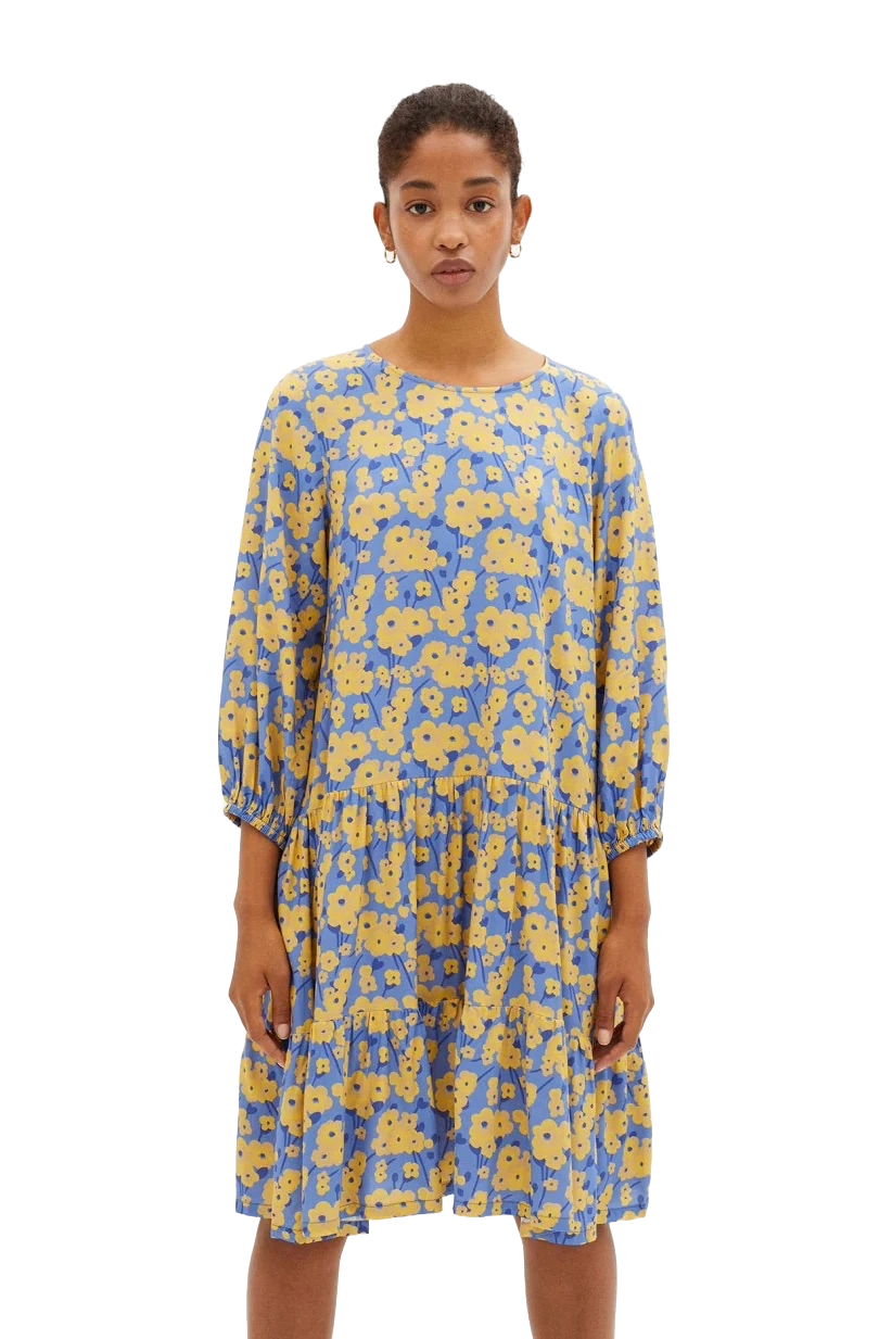 Short dress with round neck and long sleeves with elasticated cuffs, a tiered hem and a buttoned opening at the back. Made from ecovero™ viscose