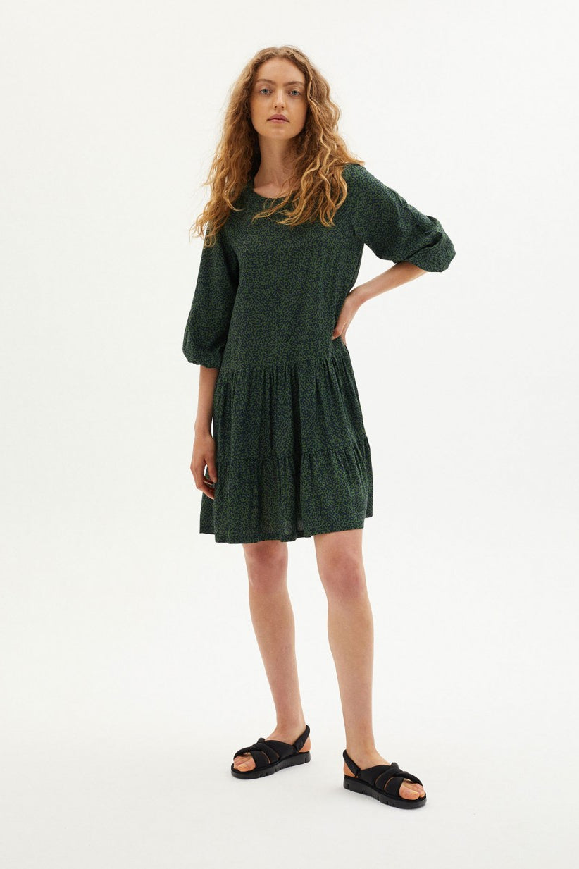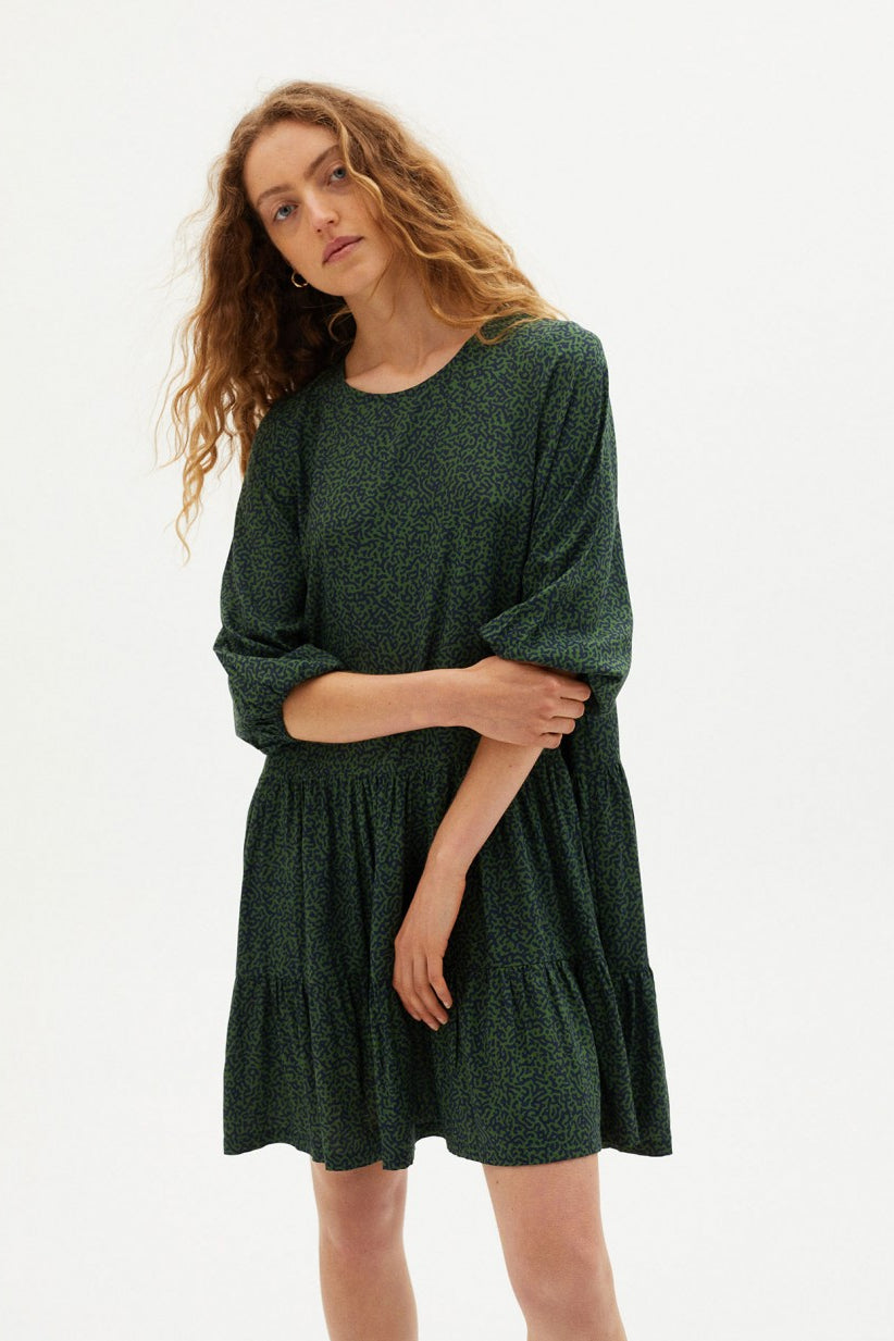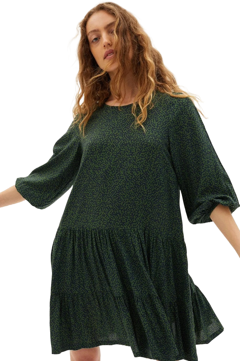 Short dress with round neck and long sleeves with elasticated cuffs, a tiered hem and a buttoned opening at the back. Made from ecovero™ viscose